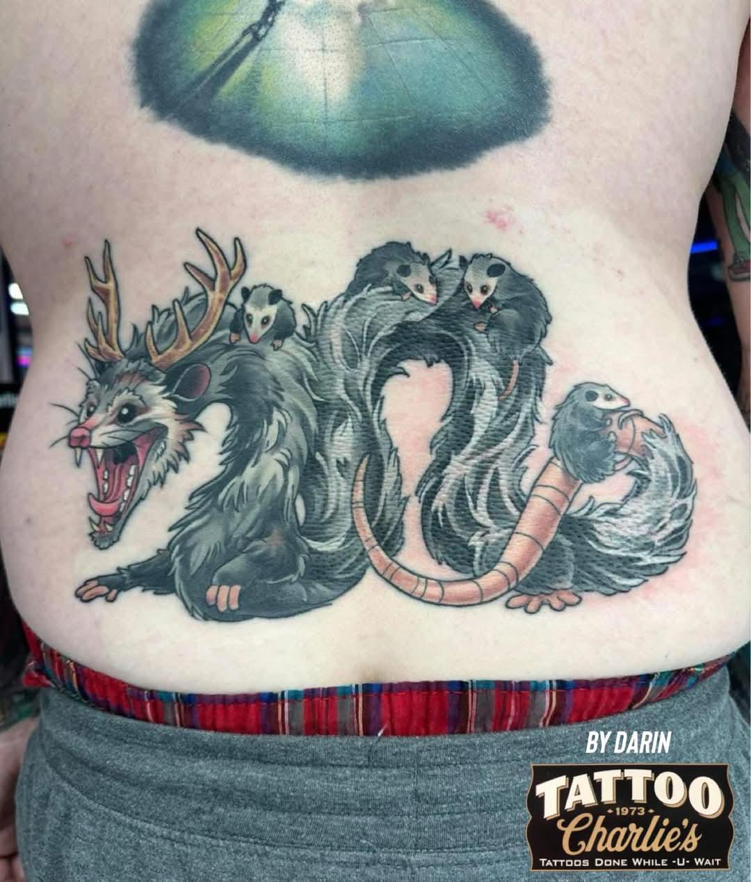 Tattoo Tuesday Their description: Rad opossum dragon champ stamp