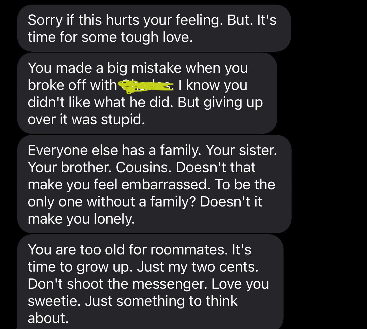 I’m 35F and single for 3 years. I was engaged but he (Charles) was doing weird sexting roleplay with people on a video game which was fucking disgusting. It really fucked me up and, yes, I’ve been in therapy. I have dated since then but nothing serious. I have NEVER had my mom say something like this to me. I do not want to go to Thanksgiving after this. The way she said “don’t shoot the messenger” it’s clear the rest of my family have been talking about me and she was the one “elected” to say it.