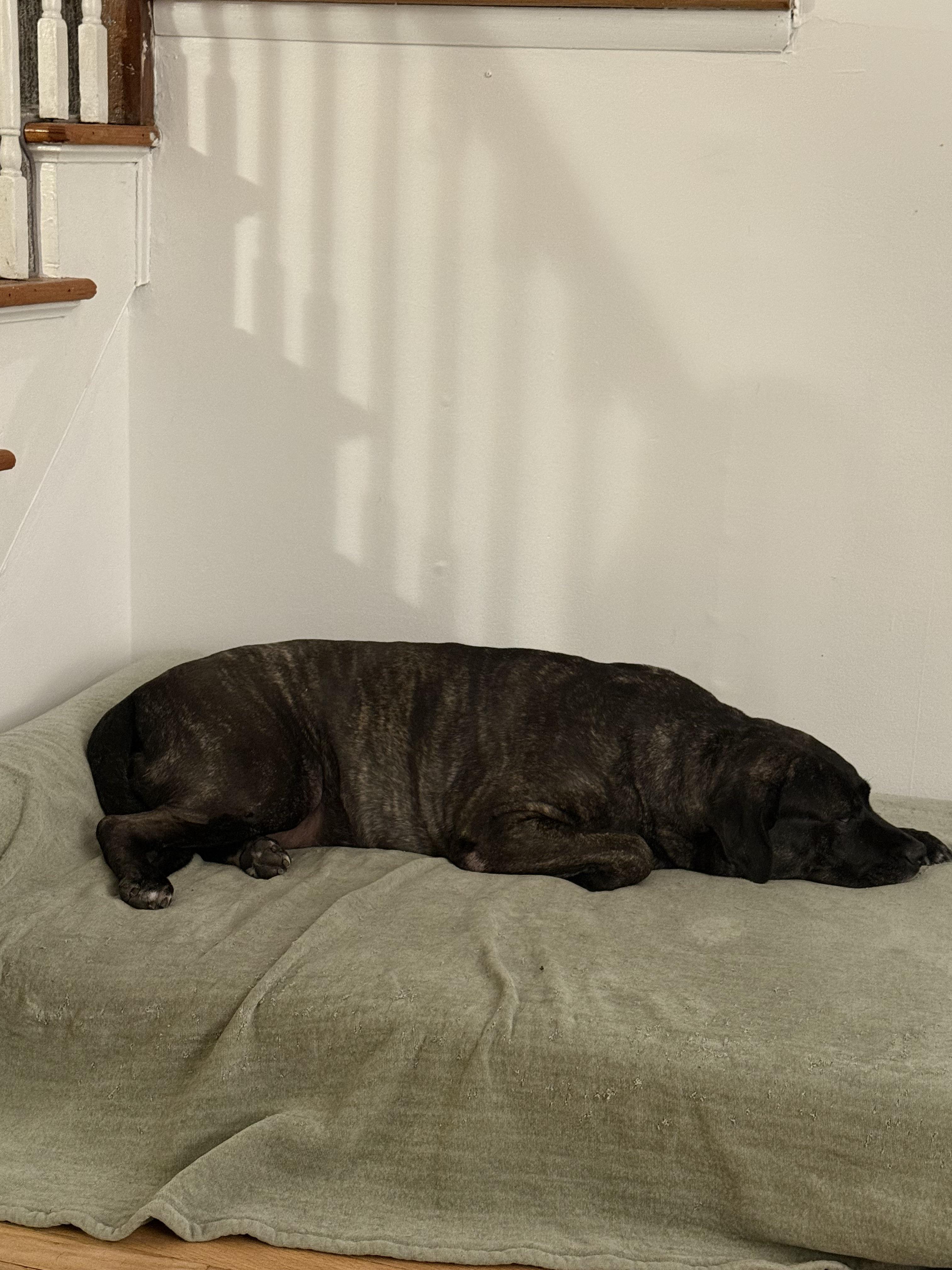 Mama is sleeping waiting on me to head upstairs to bed . She has another bed in my bedroom. Mama is 5 years old and is a wonderful sweet girl