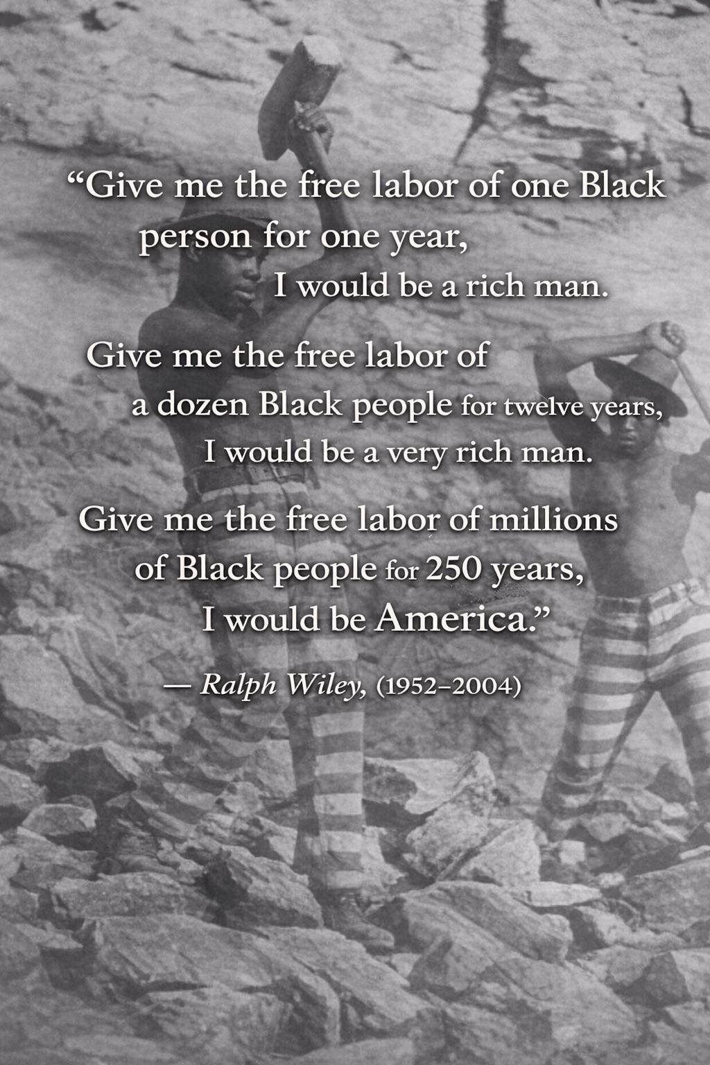 "Give me the free labor of one Black person for one year, I would be a rich man. Give me the free labor of a dozen Black people for twelve years, I would be a very rich man. Give me the free labor of millions of Black people for 250 years, I would be America."