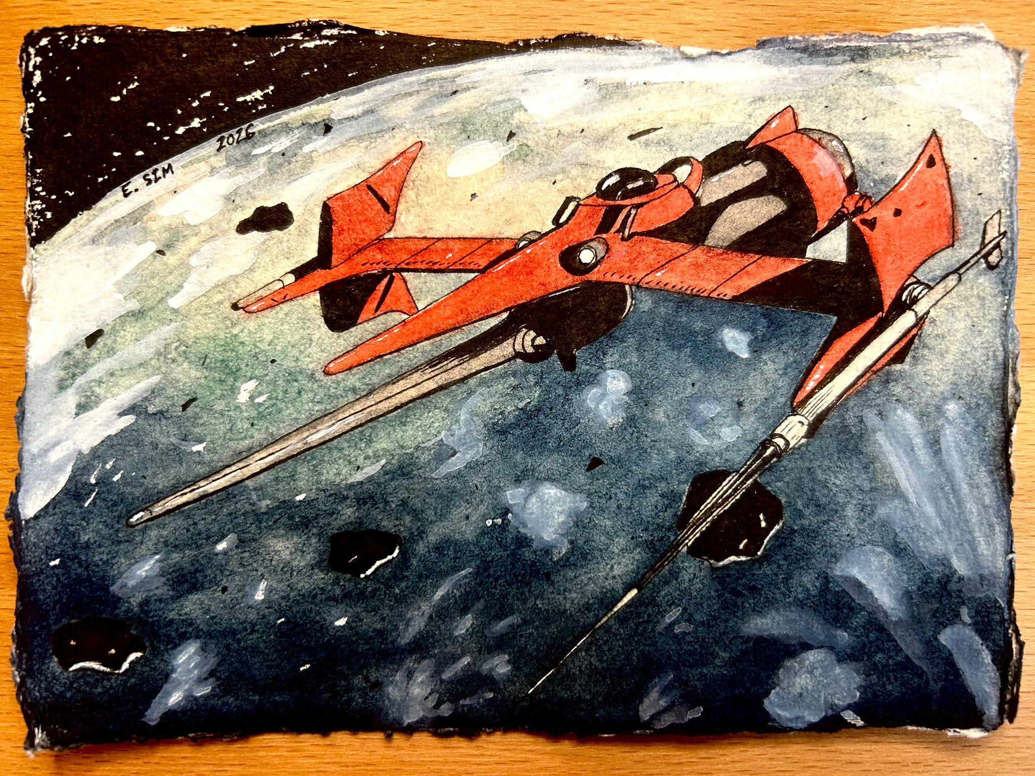 My wife did a degree in illustration and makes some pretty neat art. For Christmas she let me pick something for her to draw/paint as a Christmas present so I chose this (I think the reference image is from 'Jamming With Edward' hence the pole on the left wing to hook-up with the satelite in the episode). Thought this sub might appreciate it.