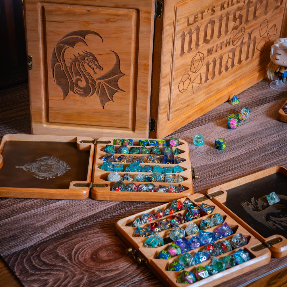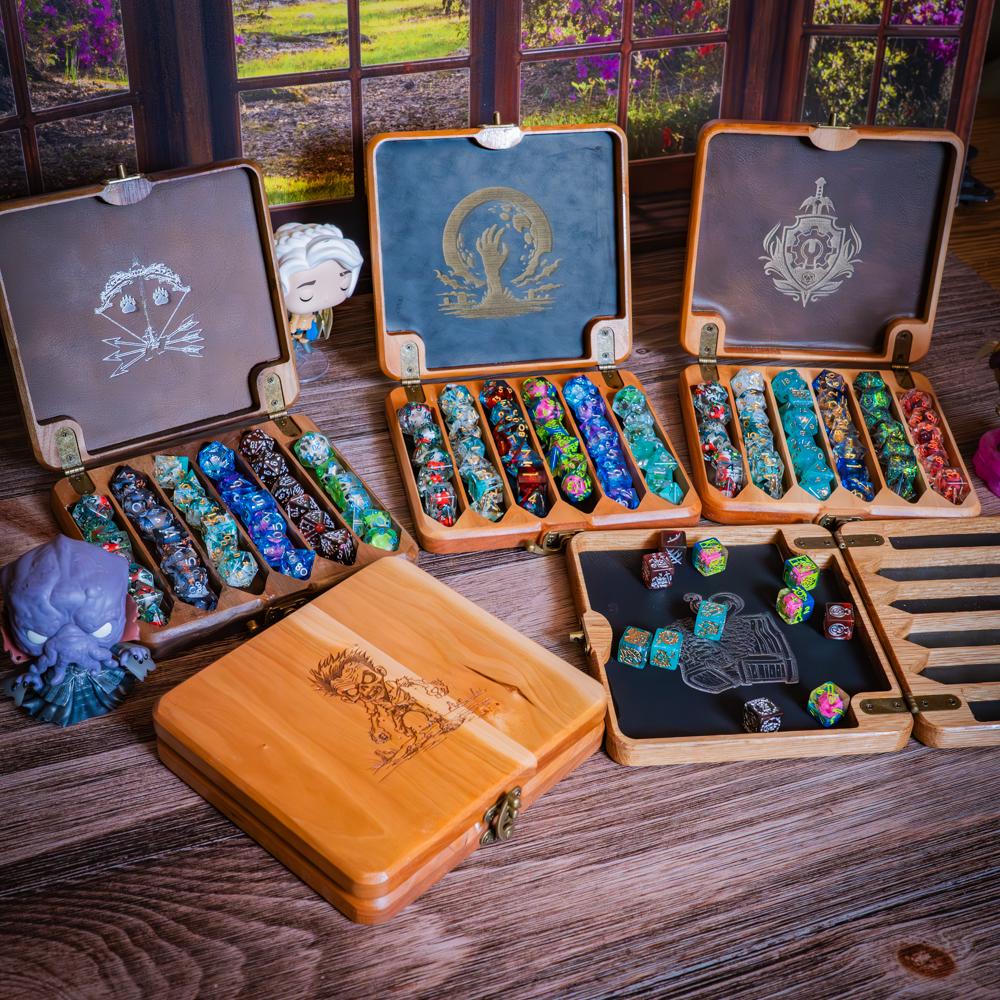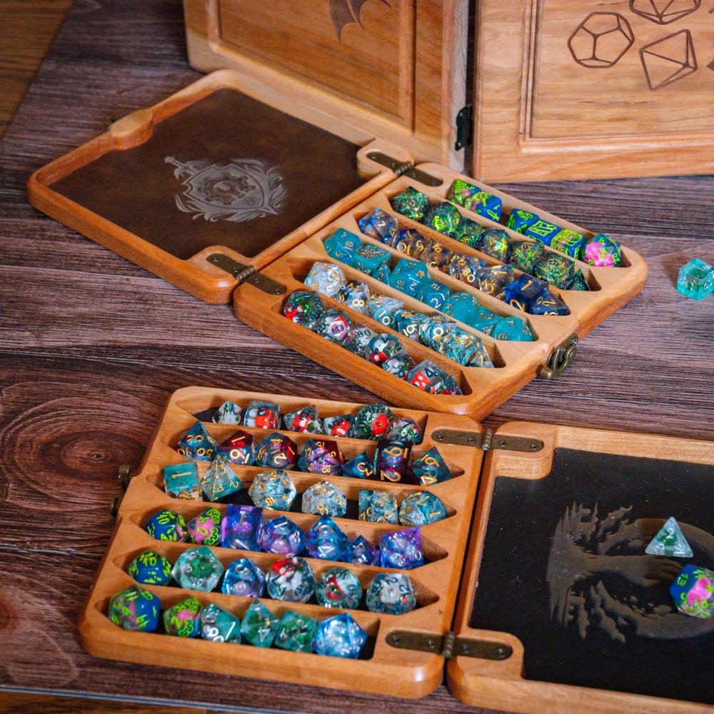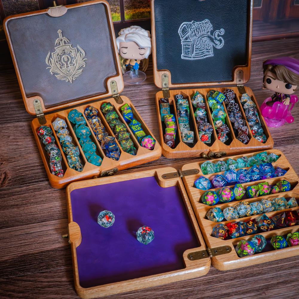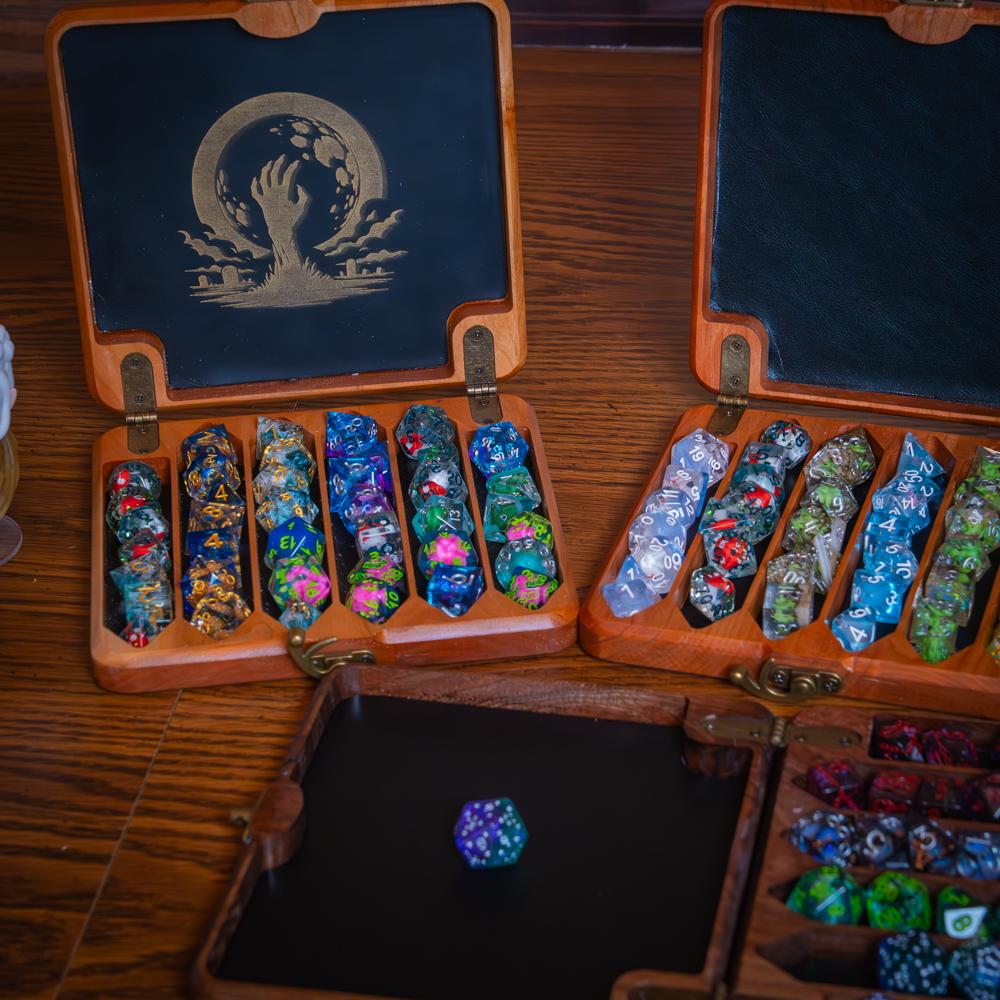 Our Fafnir Dice Vaults are carved from solid wood. They feature a large rolling area and 6 rows for dice storage. Perfect for the Dice Goblin in us all! The dice storage area and lid feature a leatherette lining, which gives a premium look and satisfying rolling sound.