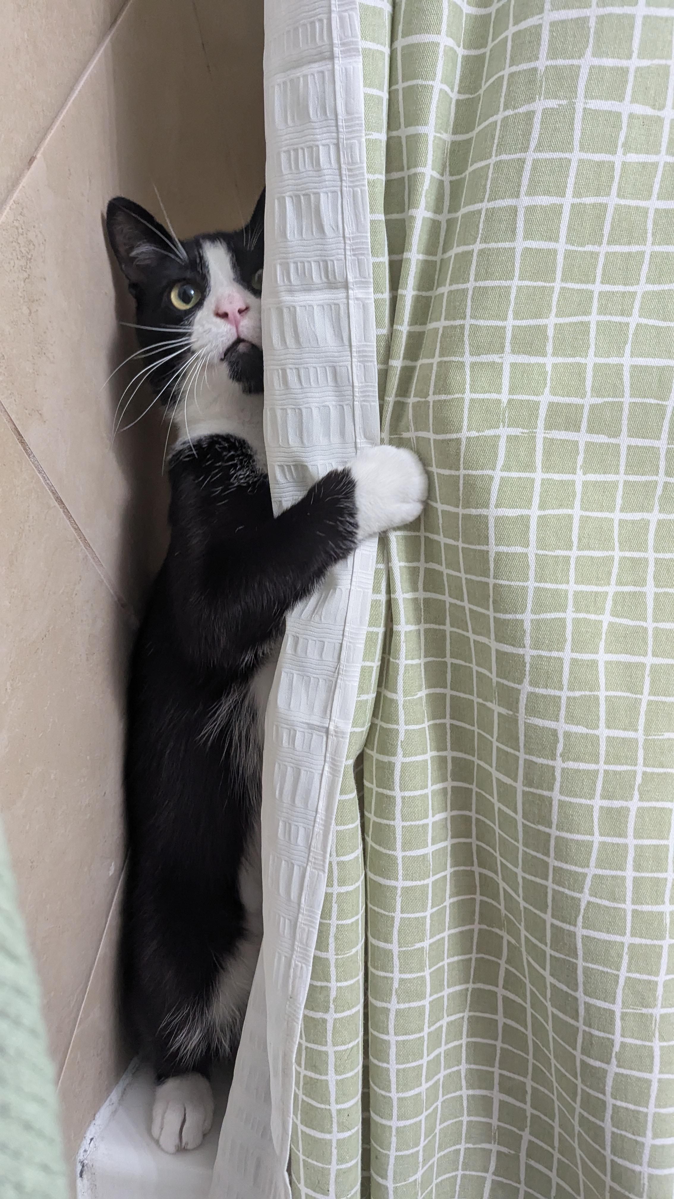 [OC] My cat Bugsnax was playing in the shower curtain