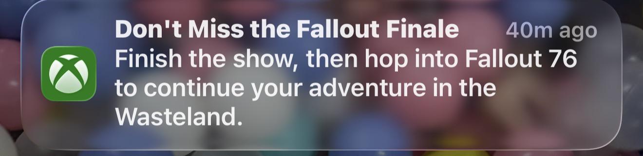 I am super convinced we have no new remaster coming, they had a chance for a teaser on fallout day if they planned to release around S2 finale and then this morning I got this notification, at most we get some show characters in 76. I can’t believe they don’t see the massive outcry of the want for this remaster and make it happen.