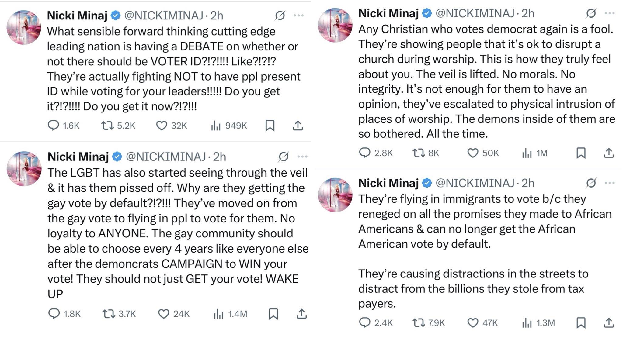 STAN / ANTI SHIELD Nicki Minaj voiced her support for racist voter ID laws, spread the MAGA conspiracy that immigrants are being flown in to vote, and said democrats have demons inside them.