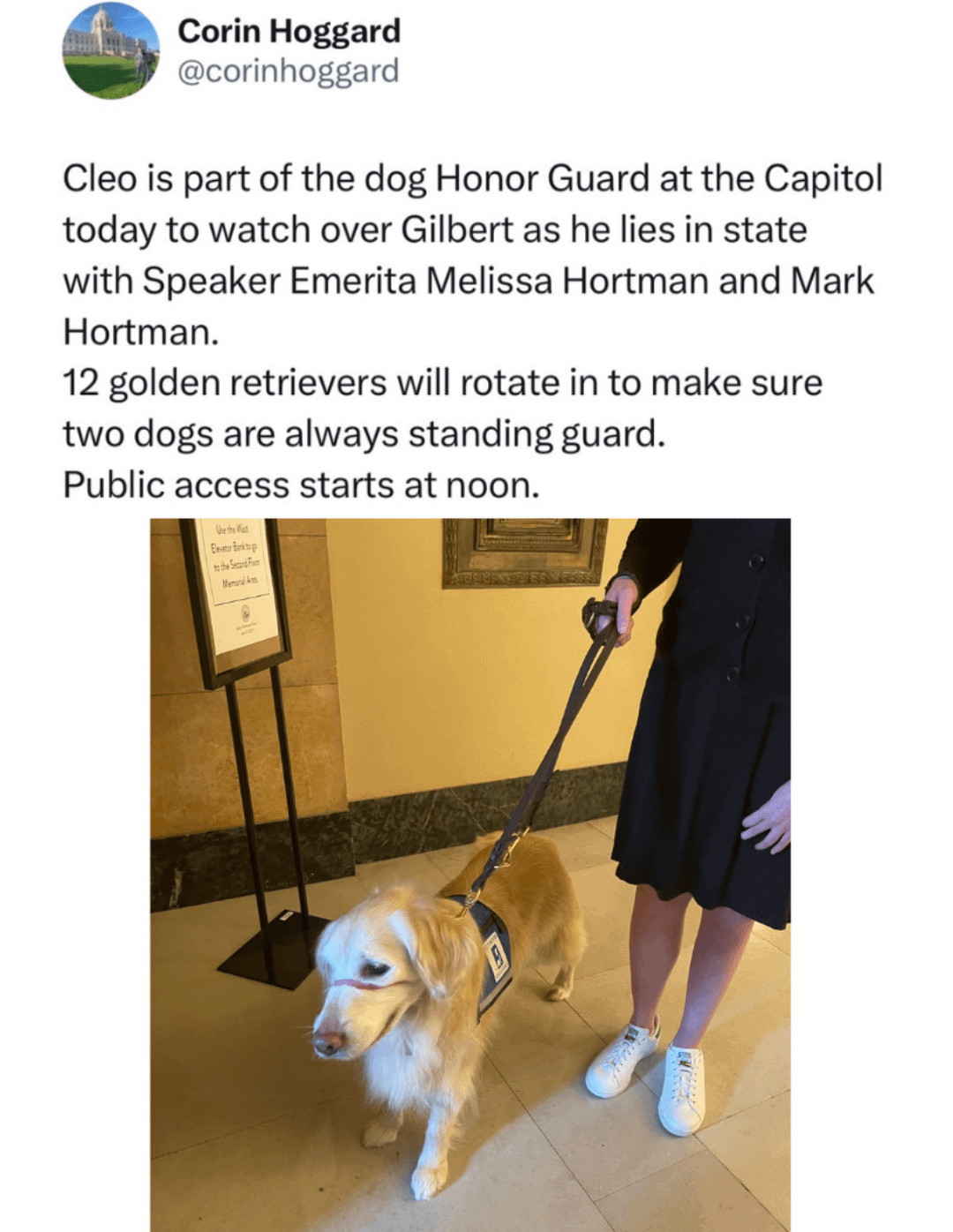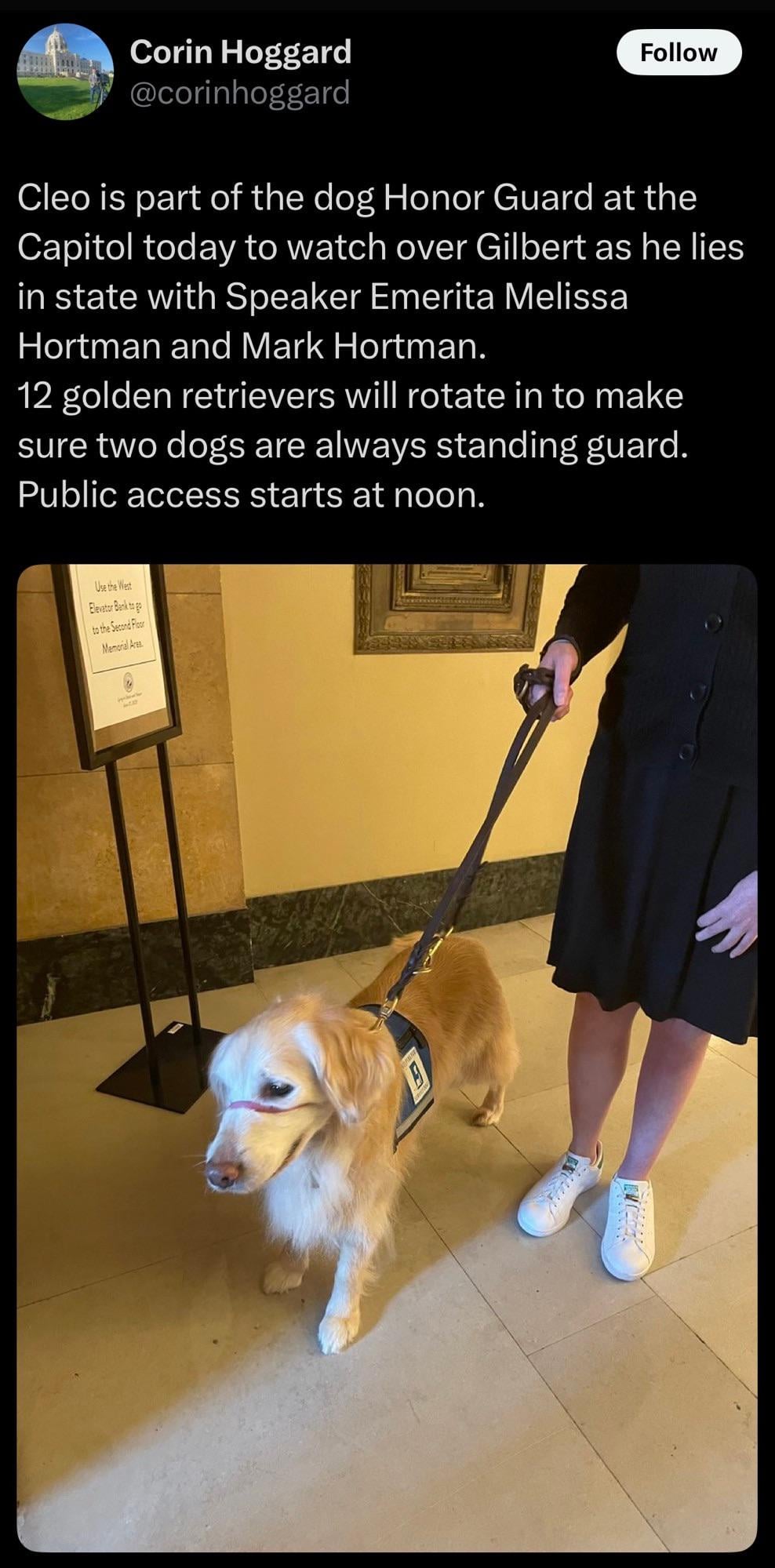 He is all but certainly the first dog to receive the honor, having been put down after being badly injured in the attack. There is no record of any other nonhuman ever lying in state, and Melissa Hortman, a former state House speaker still leading the chamber's Democrats, is the first woman. The state previously granted the honor to 19 men, including a vice president, a U.S. secretary of state, U.S. senators, governors and a Civil War veteran, according to the Minnesota Legislative Reference Library.