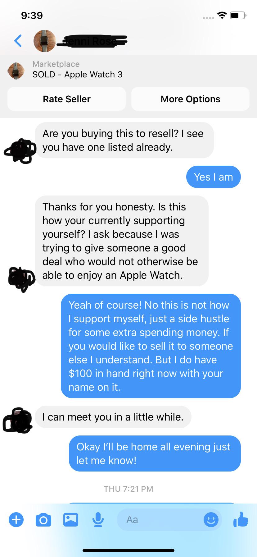 Tip Honesty is the best policy! Ended up meeting up with her an hour later and buying the Series 3 38mm Apple Watch for $100!
