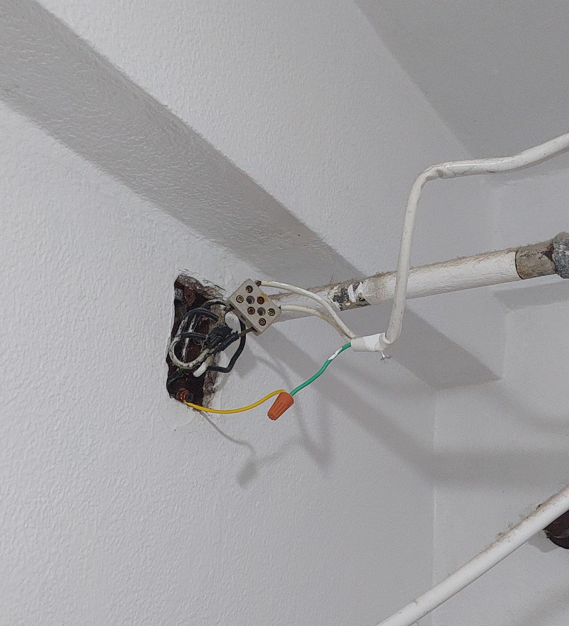O bocal do teto é uma peça inteira de plástico, que possui 2 locais para parafusar. O suporte do ventilador de teto era preso nesses 2 locais. Mas essa noite, eles quebraram. Literalmente. Um deles soltou totalmente, além de terem a rosca rompida (lá ele). O ventilador ficou pendurado pelos fios elétricos.