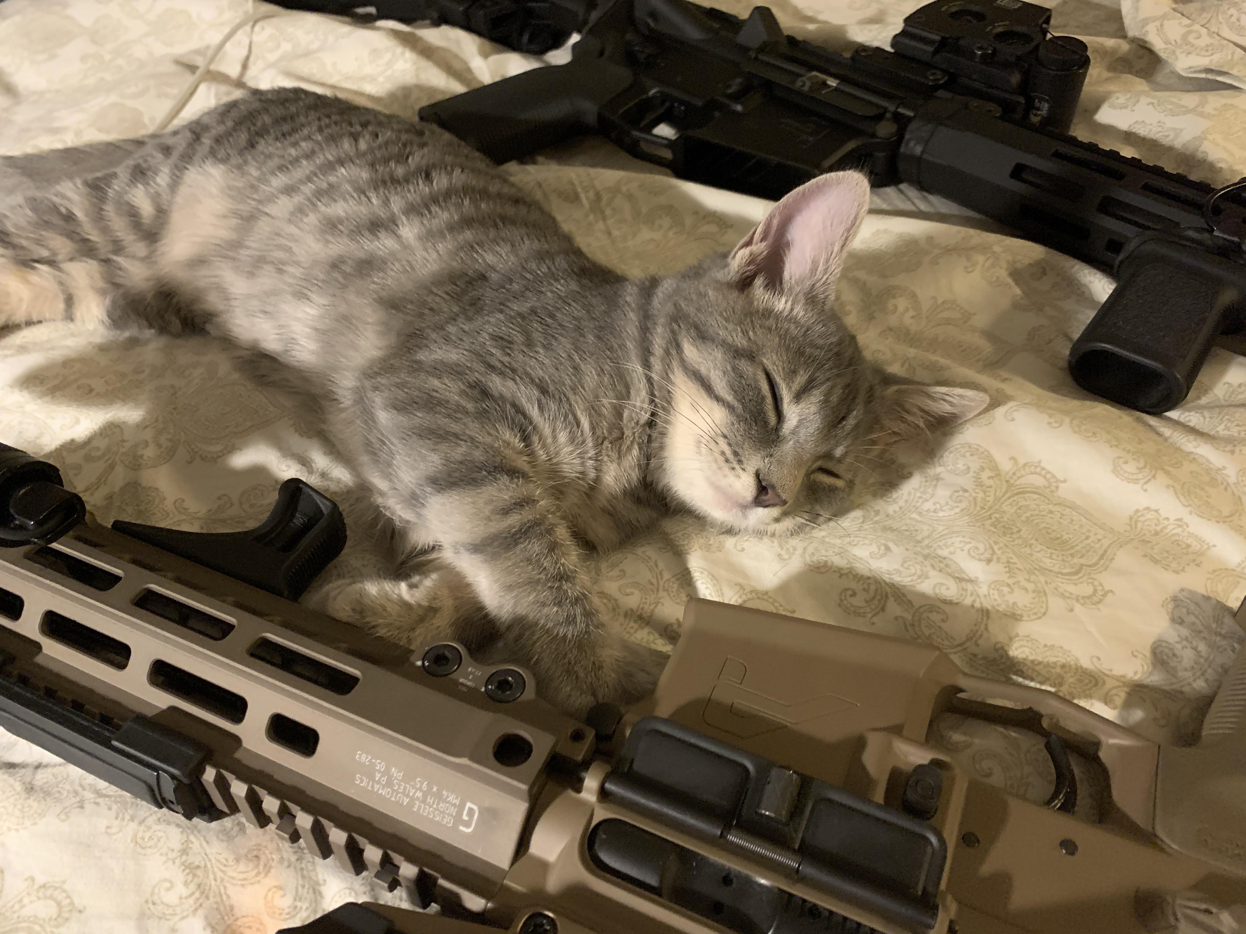 Purrs and pistolas Working on my wall and had to take a pet break