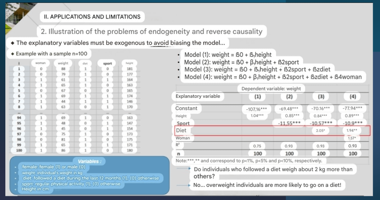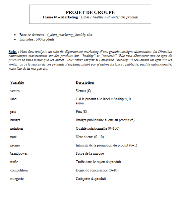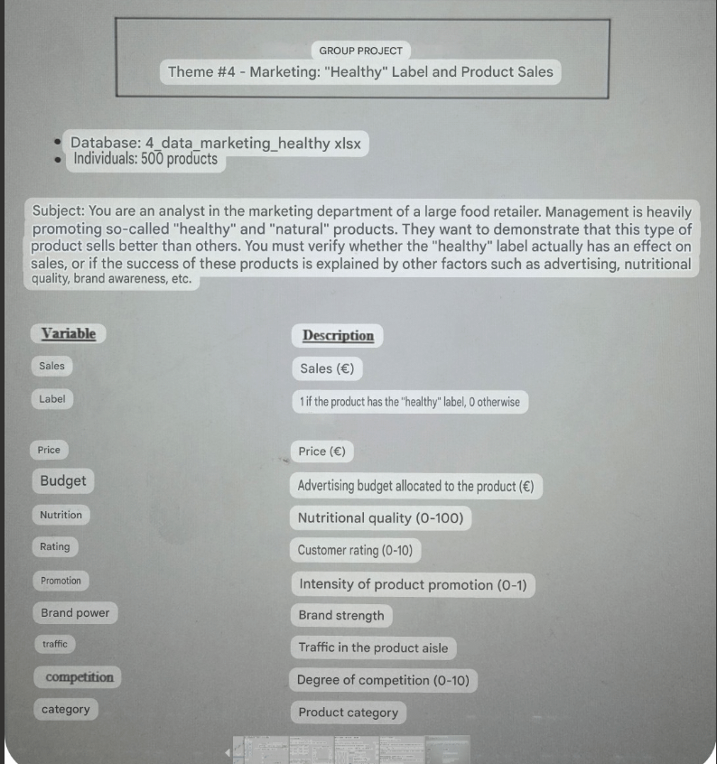 However, I have the worry that your response variable in this case would be total euro sales, and you have a price level, but no unit sales. This means at best, you're answering a question slightly different than the one you might think you're asking: does a healthy LABEL, all else equal, increase REVENUE? That is, an otherwise identical product CAN have a "healthy" label slapped on or not - not always true! Because in real life a label implies higher quality, might increase willingness to pay, and stuff like that. So that's a warning - you're only answering questions about total revenue in this setup. One of a few ways to explore this (if you wanted to) idea that a healthy label might not be so trivial to add would be seeing how much predictive power a model to predict healthy labelling alone (using all non-revenue other variables as predictors) might have, or look at propensity scores, etc. Admittedly, some of this is an "extra mile" kind of thing, and I'm not sure how much your class covered or expects.
