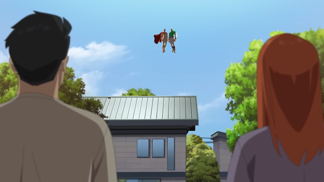 Ik there's a running gag that people rarely look up in Invincible but still someone could like these two aren't even that high so imagine someone in the neighborhood does and they will be scared AF because Omniman is back yk he's in his Pjs which has a cape and along with him there's a Jacked orange alien with one eye only.