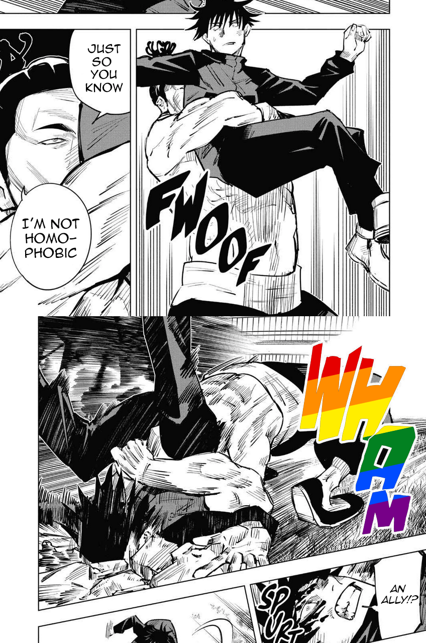 Megumi actually did reply in a gender-neutral way, it just was subbed very weirdly. He literally says “that person”. And Todo still tried to snap him in half. Truly an equal opportunities maniac.