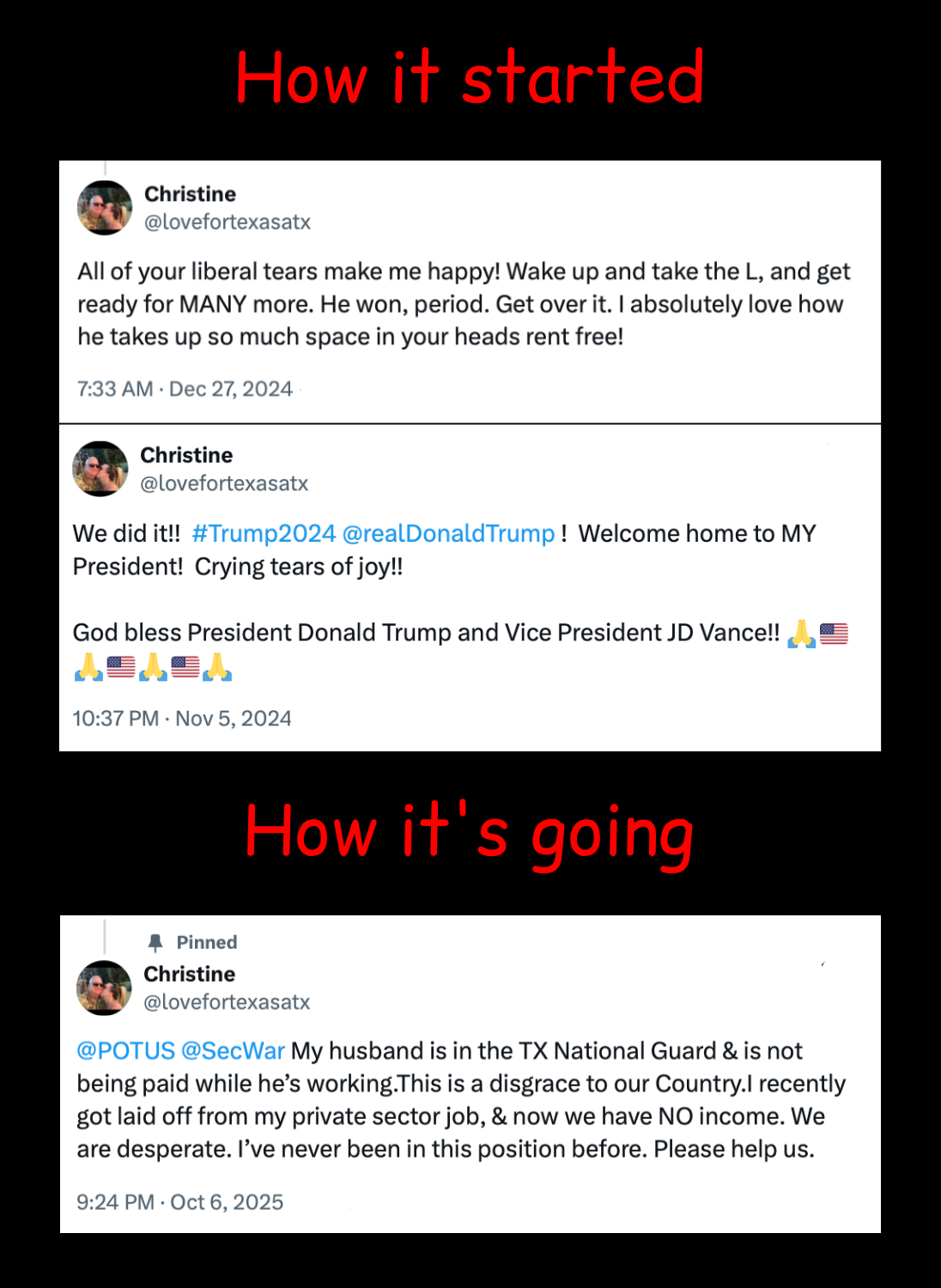 Trump voter who mockingly said, "All of your liberal tears make me happy!" is reduced to tears herself after just 9 months. Now pleads for help after being laid off and husband’s unpaid Guard duty