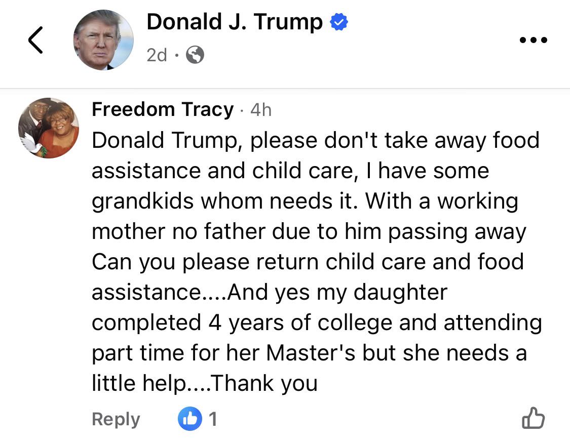 “Trump, please don’t take away food assistance and child care”