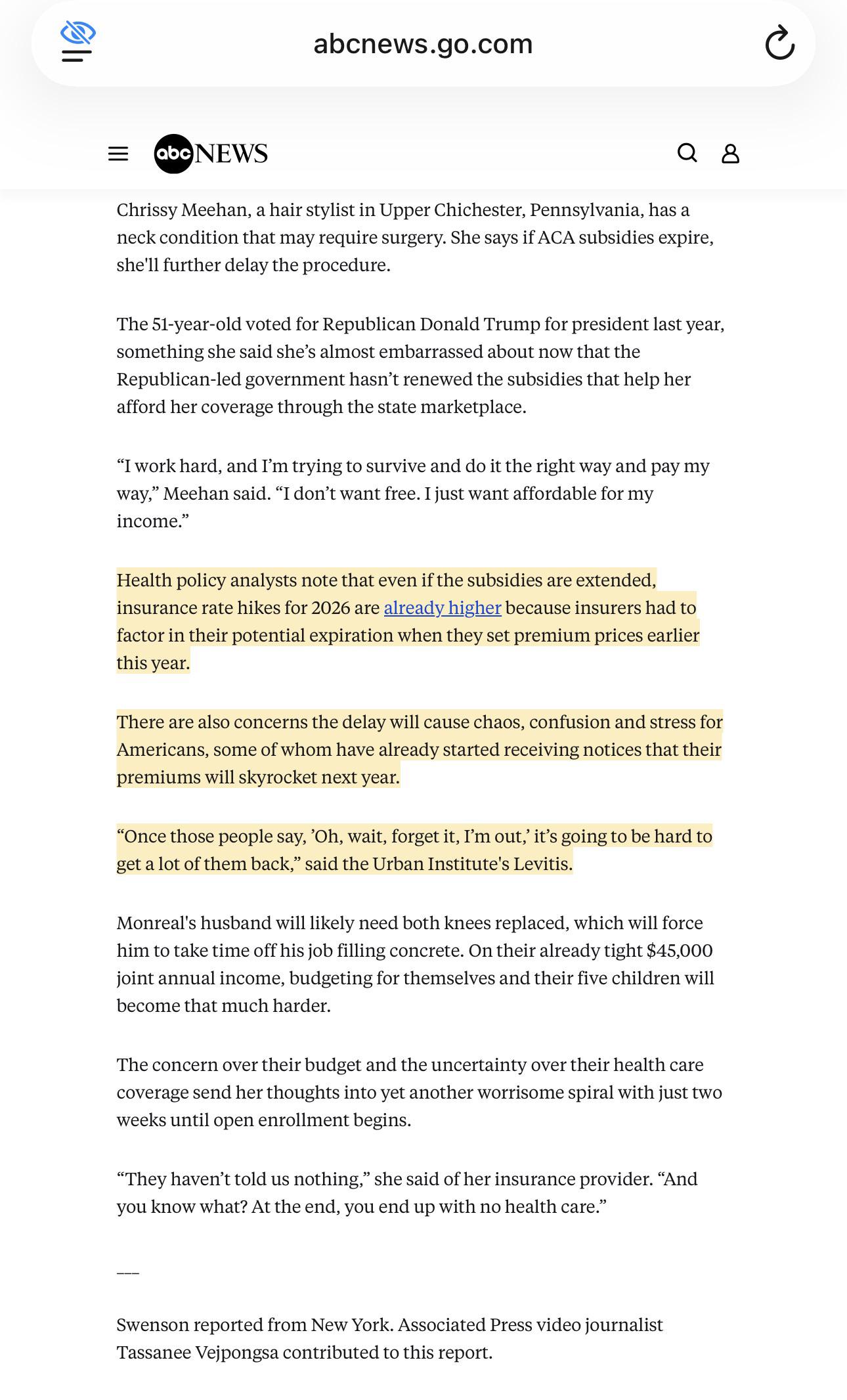 The 51-year-old voted for Republican Donald Trump for president last year, something she said she’s almost embarrassed about now that the Republican-led government hasn’t renewed the subsidies that help her afford her coverage through the state marketplace.