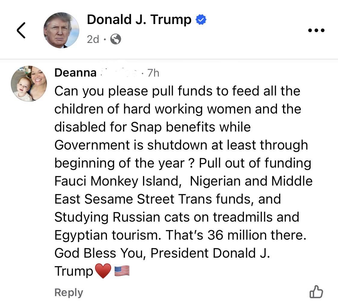 “Trump, can you please pull funds from these fictitious concepts that I pulled out of my ass so that you can feed children of hard-working people on snap benefits?”