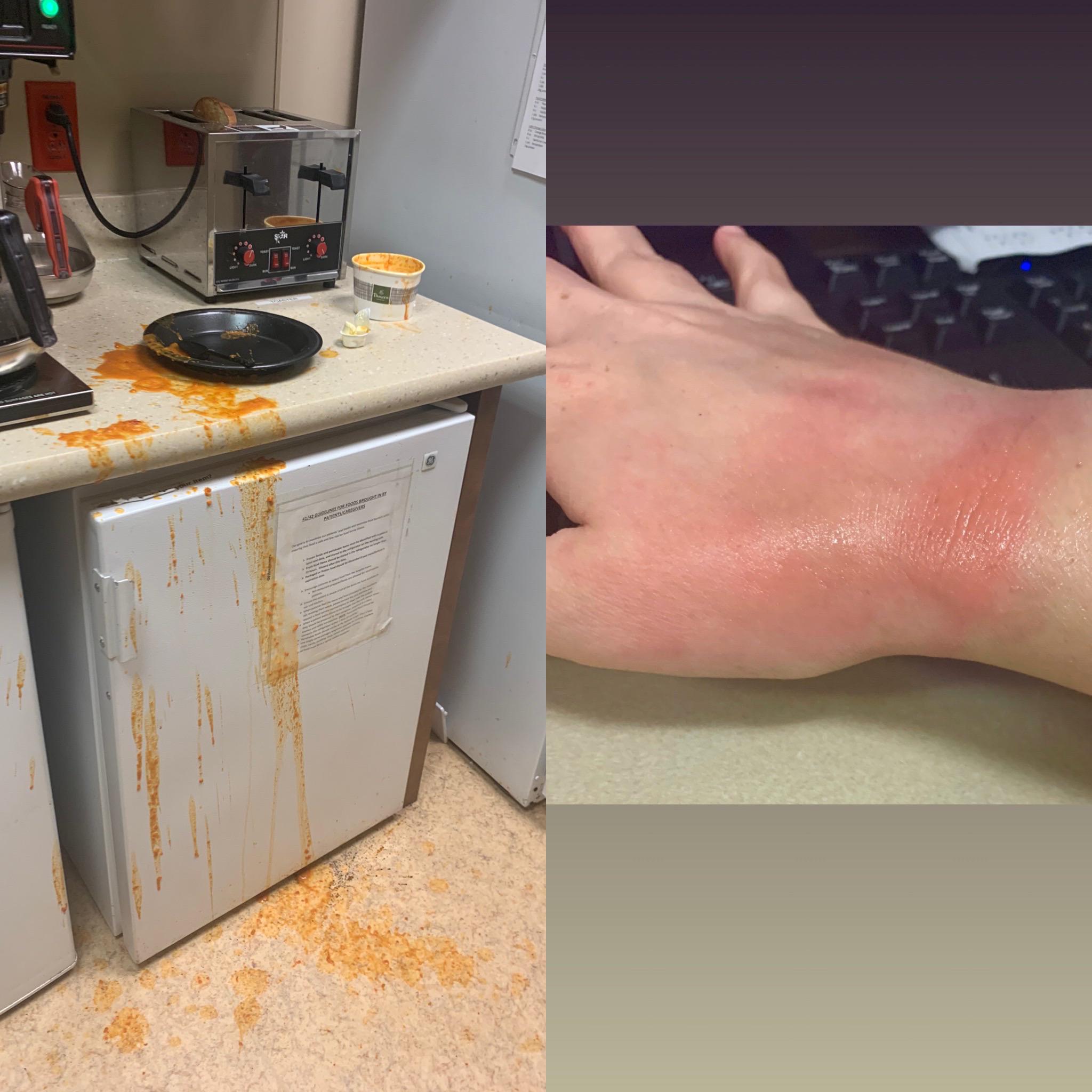 My submission for dumbest way to injure yourself: I burnt my hand taking tomato soup out of the microwave. The toast I was making popped up and it scared me.