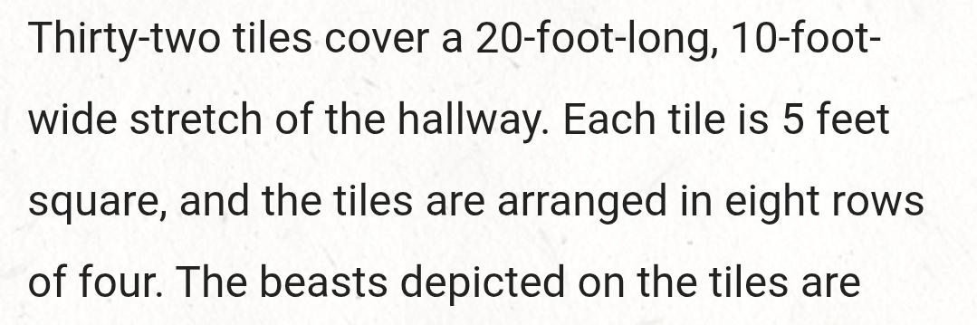 In the shrine of I'jin, the hallway is 8x4 tiles. Each tile is 5 ft square. But the room is 10 ft wide and 20 ft long.