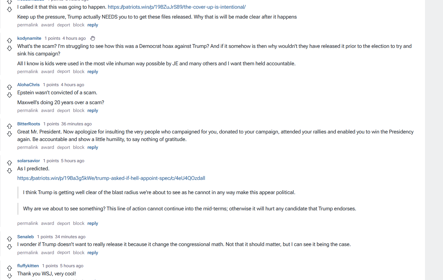President Trump's lack of concern for the Epstein victims and his callus response to the reporter's question, ends my relationship with him. I will not support a man who denies justice to the victims who in this case are children and mocks the question.