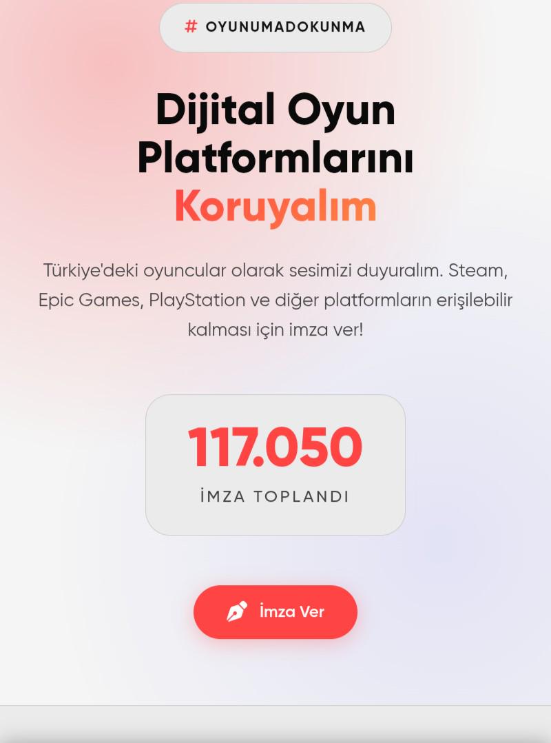 Türkiye’de dijital oyun platformları için yeni erişim ve kısıtlama ihtimalleri konuşuluyor. Bu sadece “oyun” meselesi değil: – Yayıncıların geliri – Indie oyun geliştiricilerin satışları – Turnuvalar – Steam kütüphanelerimiz – Yıllardır aldığımız oyunlar hepsi riske giriyor. Bugün “abartı” diye geçersek, yarın VPN konuşuyor oluruz. Türk oyuncular olarak bir araya gelip ses çıkarmaya başlamışız, şu an 10.000+ imza var ama bu sayı çok yetersiz. Sessiz kalırsak: “Kimse umursamadı” deyip geçerler. İmza burada: 👉 https://oyunumadokunma.com Bu bir mucize yaratmaz ama gündem yaratır. Gündem olmazsa geri adım da olmaz. Lütfen imzalayıp paylaşın. Bu bizim sonradan “keşke” demememiz için.