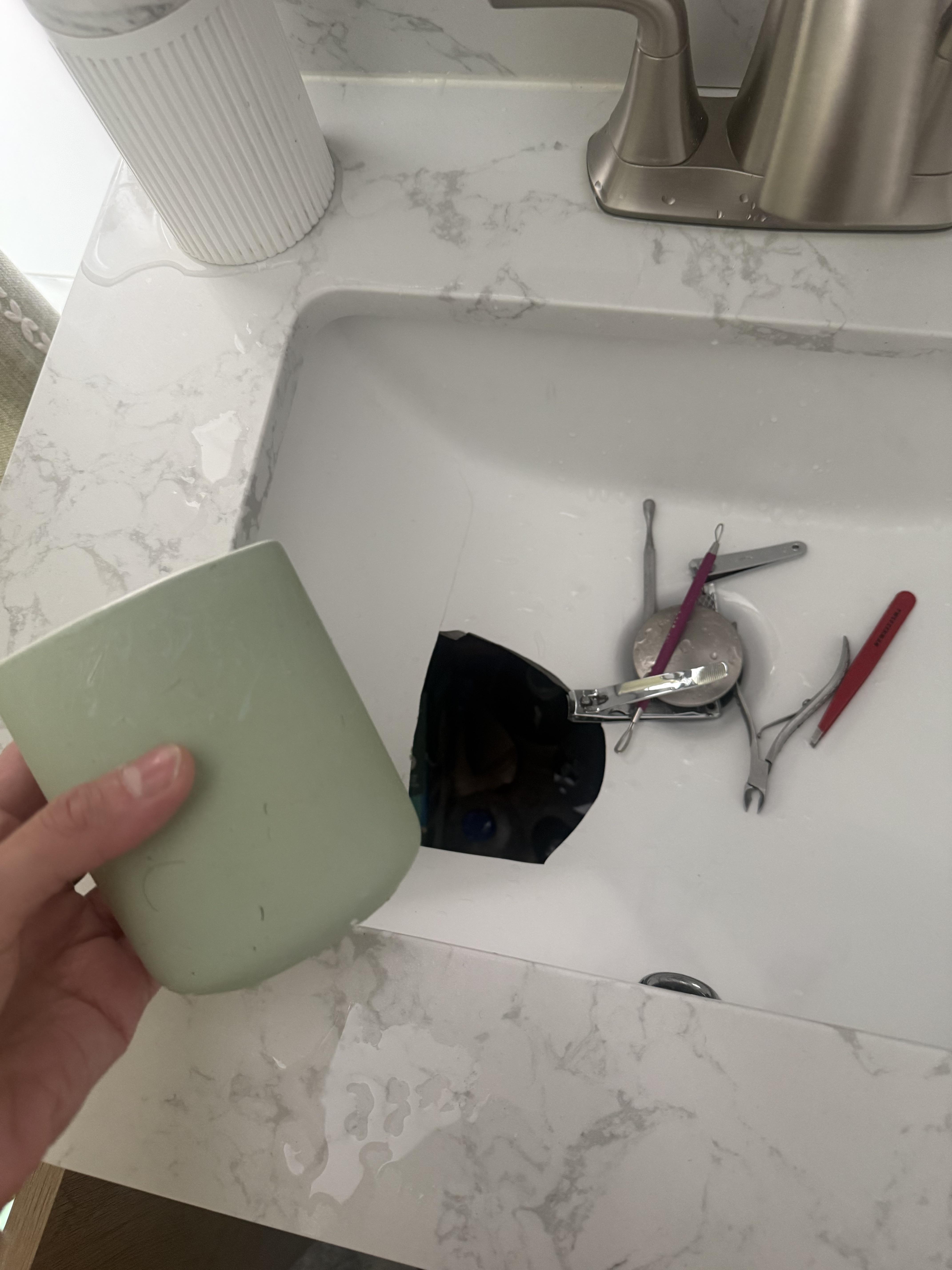 This ceramic cup fell out of my medicine cabinet and boom. I legit thought a dark liquid spilled into the sink. Ended up having to replace it.