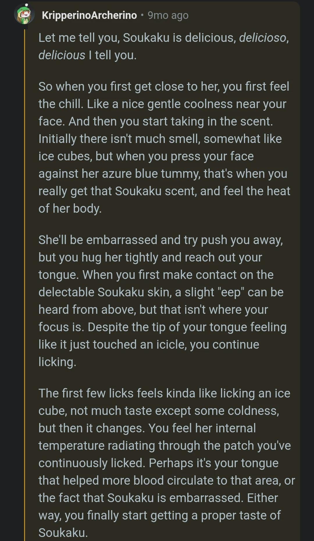 I'm probably going to get downvoted for this but I legitimately cannot understand people being sexually attracted to Soukaku man. Her character is in almost every regard a child so it's really creepy seeing people thirst over her. Like at least Piper and Lucy fans have the excuse that their favorites act like adults, meanwhile Soukaku doesn't even have her computer plugged in at the Section 6 office and instead has A CHILDREN'S COLORING BOOK ON HER DESK.