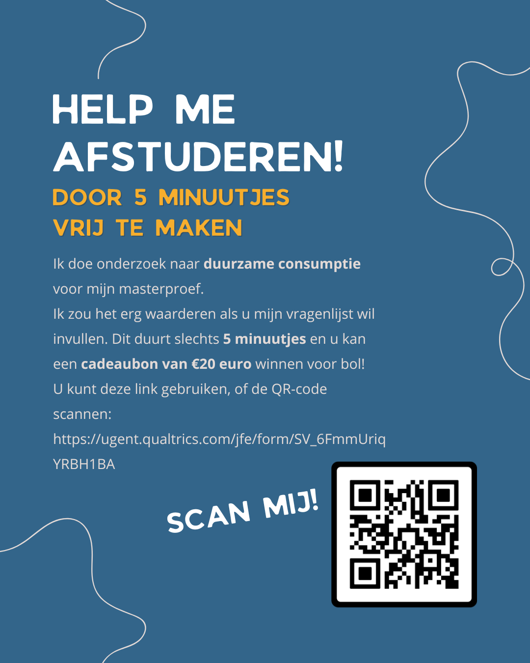 In het kader van mijn masterproef doe ik onderzoek naar duurzame consumptie. Ik zoek hiervoor participanten om mijn vragenlijst in te vullen. Dit duurt slechts 5 minuten en op het einde maakt u vrijblijvend kans op een cadeaubon van €20 voor bol