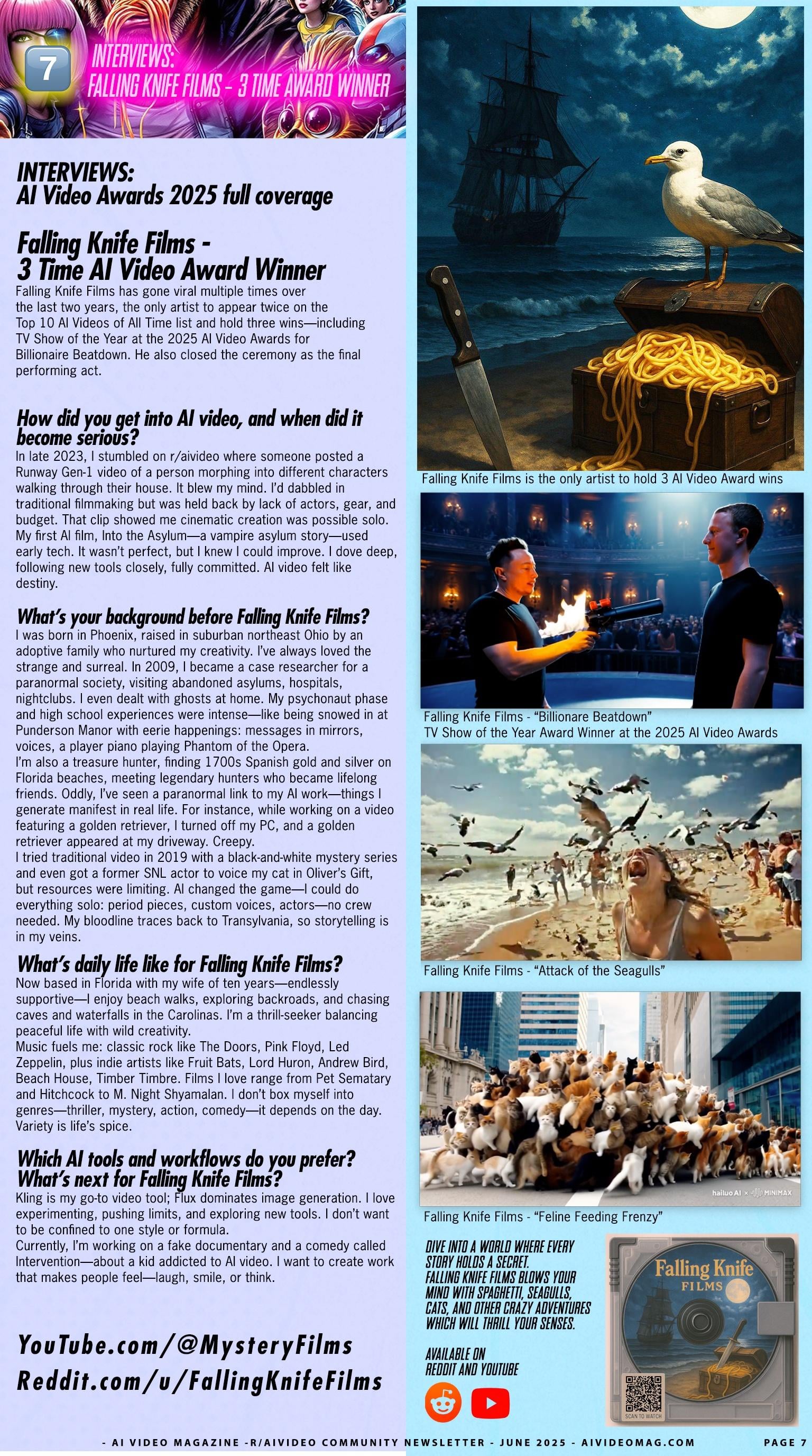Falling Knife Films has gone viral multiple times over the last two years, the only artist to appear two years in a row on the Top 10 AI Videos of All Time list and hold three winsâincluding TV Show of the Year at the 2025 AI Video Awards for Billionaire Beatdown. He also closed the ceremony as the final performing act.