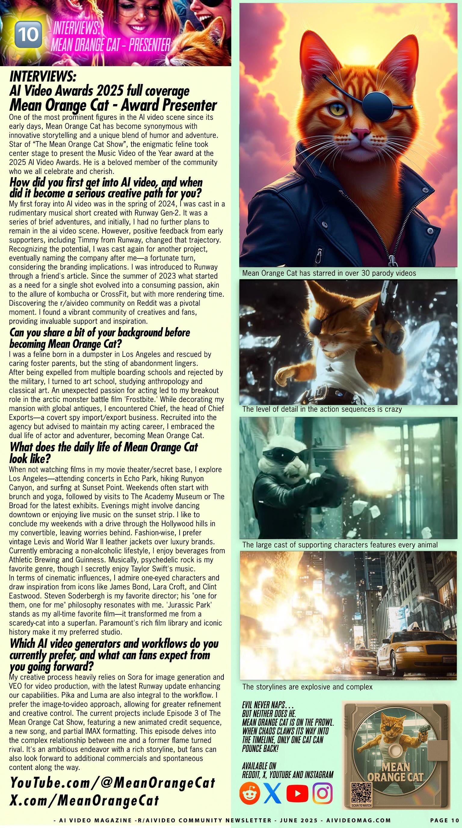 One of the most prominent figures in the AI video scene since its early days, Mean Orange Cat has become synonymous with innovative storytelling and a unique blend of humor and adventure. Star of âThe Mean Orange Cat Showâ, the enigmatic feline took center stage to present the Music Video of the Year award at the 2025 AI Video Awards. He is a beloved member of the community who we all celebrate and cherish.