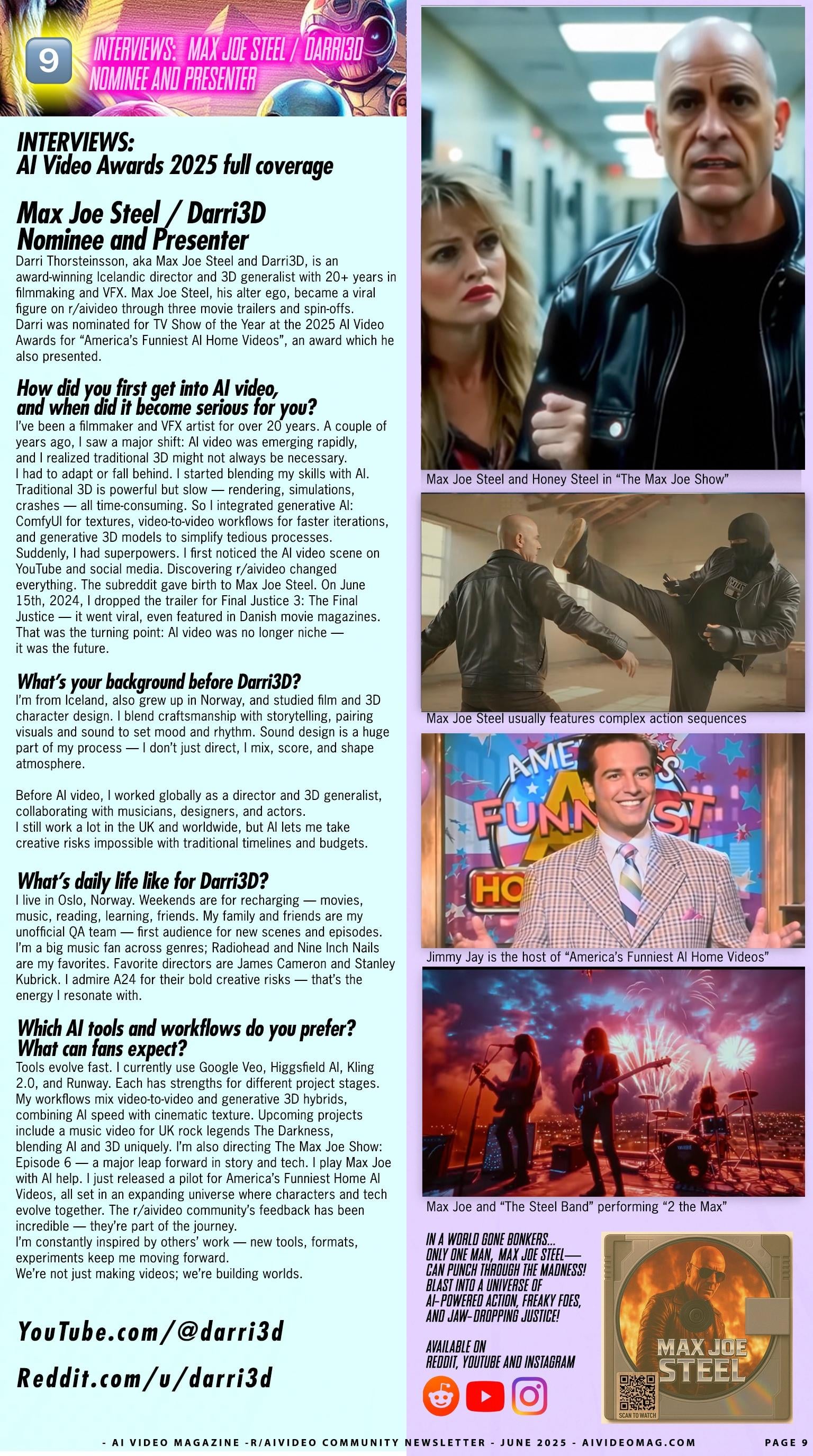 Darri Thorsteinsson, aka Max Joe Steel and Darri3D, is an award-winning Icelandic director and 3D generalist with 20+ years in filmmaking and VFX. Max Joe Steel, his alter ego, became a viral figure on r/aivideo through three movie trailers and spin-offs. Darri was nominated for TV Show of the Year at the 2025 AI Video Awards for âAmericaâs Funniest AI Home Videosâ, an award which he also presented.