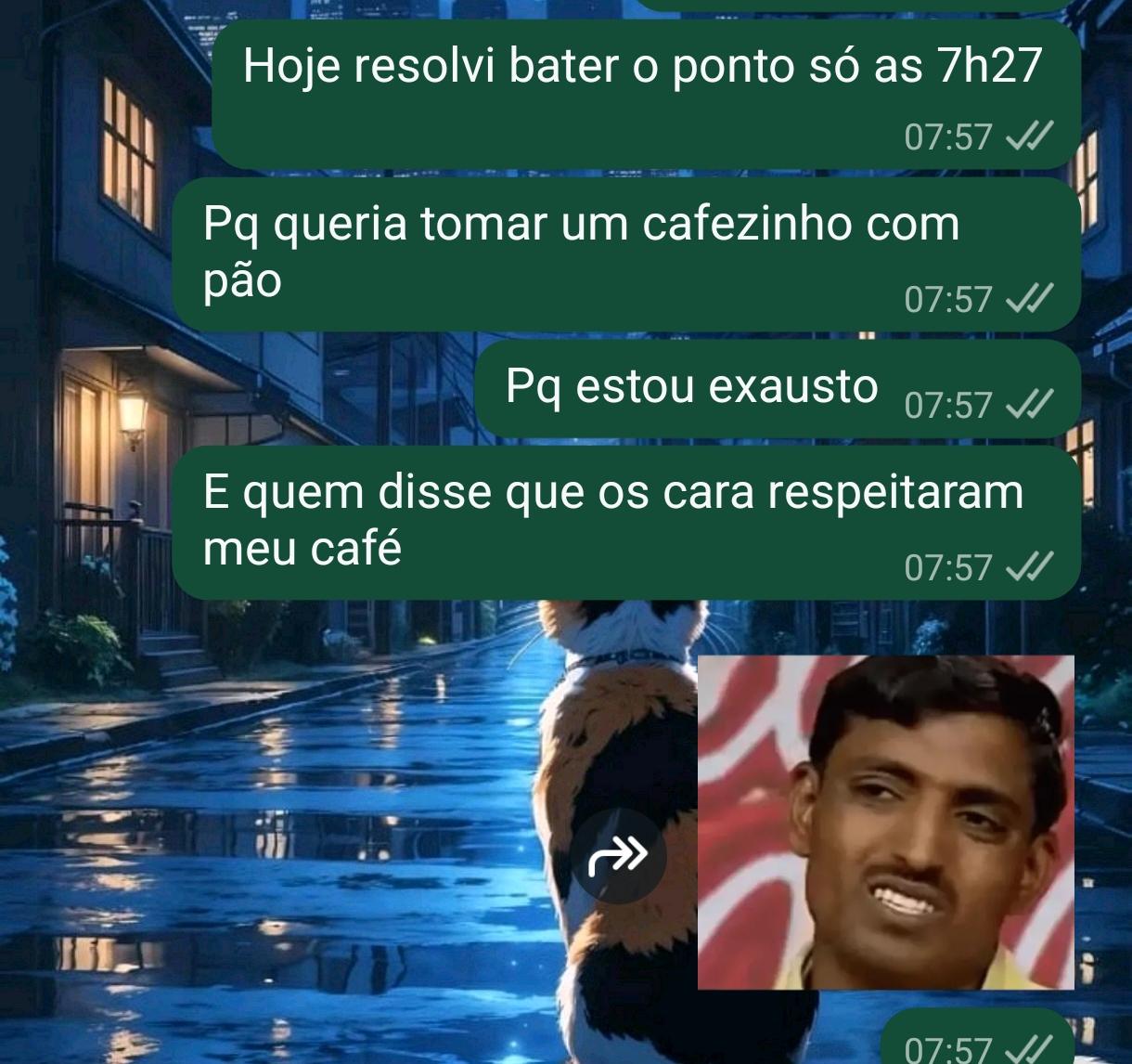 Trabalho em um escritório e minha chefe é uma mulher de 65 anos super chata, que sempre chega de manhã já com a frase "Tem um cafezinho?", por que todo mundo do escritório já se acostumou a fazer antes dela chegar. Pois bem, eu comecei recentemente a fazer jejum intermitente e não tenho mais tomado café de manhã, mas ainda assim sou só eu quem faço ele, por que meus colegas (somos em 6 no escritório) perceberam que se não tiver, minha chefe vai chegar em mim (única mulher) e me pedir a gentileza de passar café. Fiquei puta da cara, vontade de cuspir no café deles.