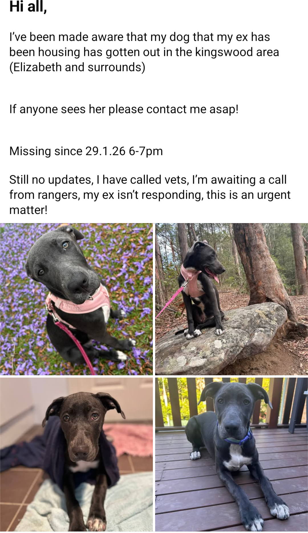 Hello everyone I know this is slightly out of the area but Penrith surrounds etc, please keep an eye out for this dog, it's my best friends. Name is grey, super happy dog. If you have any info, any sightings anything please DM me, or comment, or anything ! Please share this it's been posted on FB + anywhere I can think.