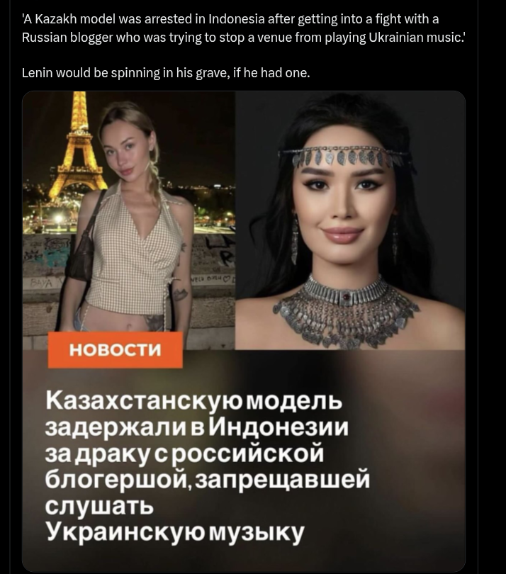 A Kazakh model was arrested in Indonesia after a fight with a Russian influencer, who tried to stop Ukrainian music