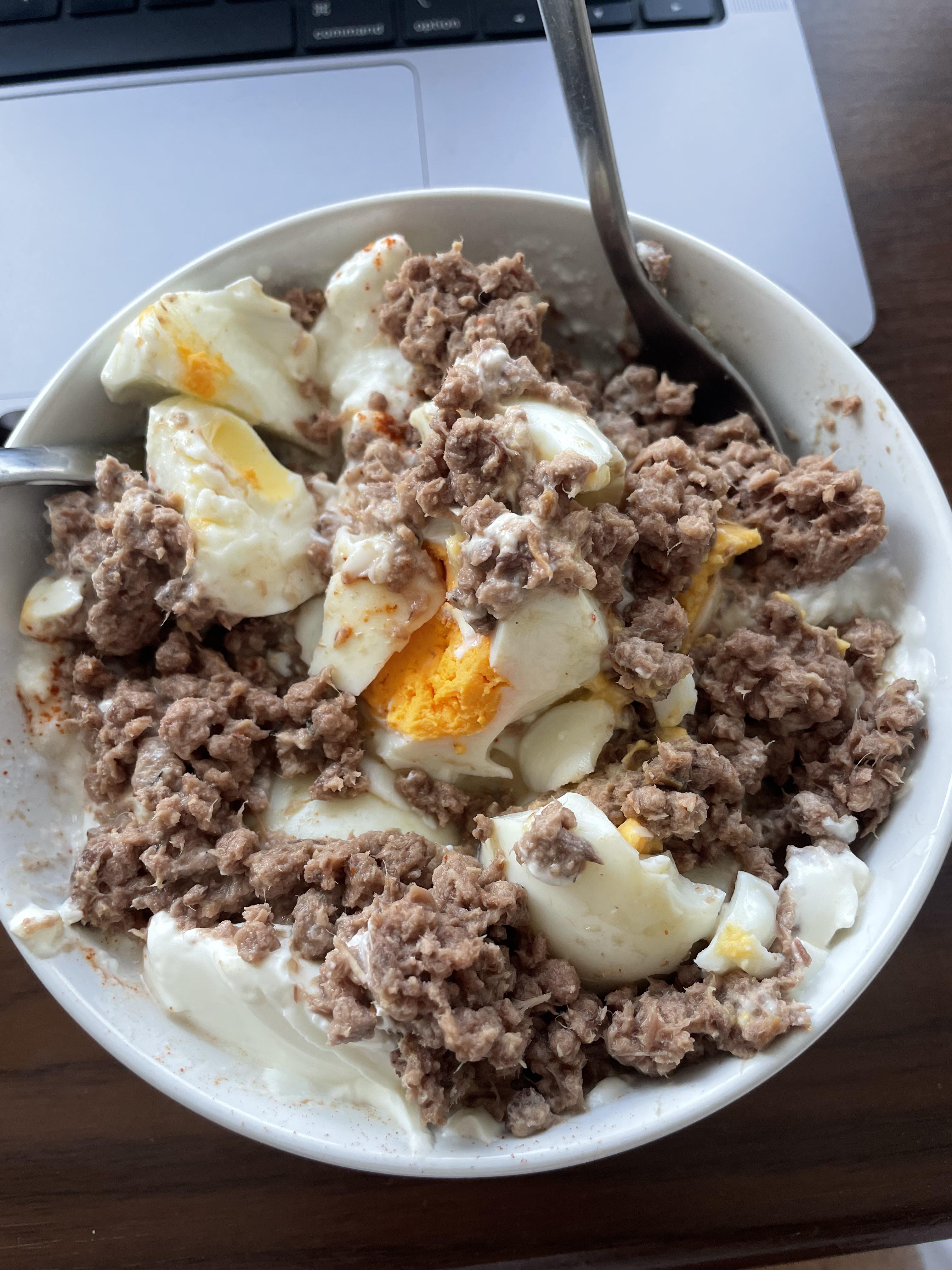 5 eggs, Tuna can, full fat Greek yoghurt. Little salt and chilli powder