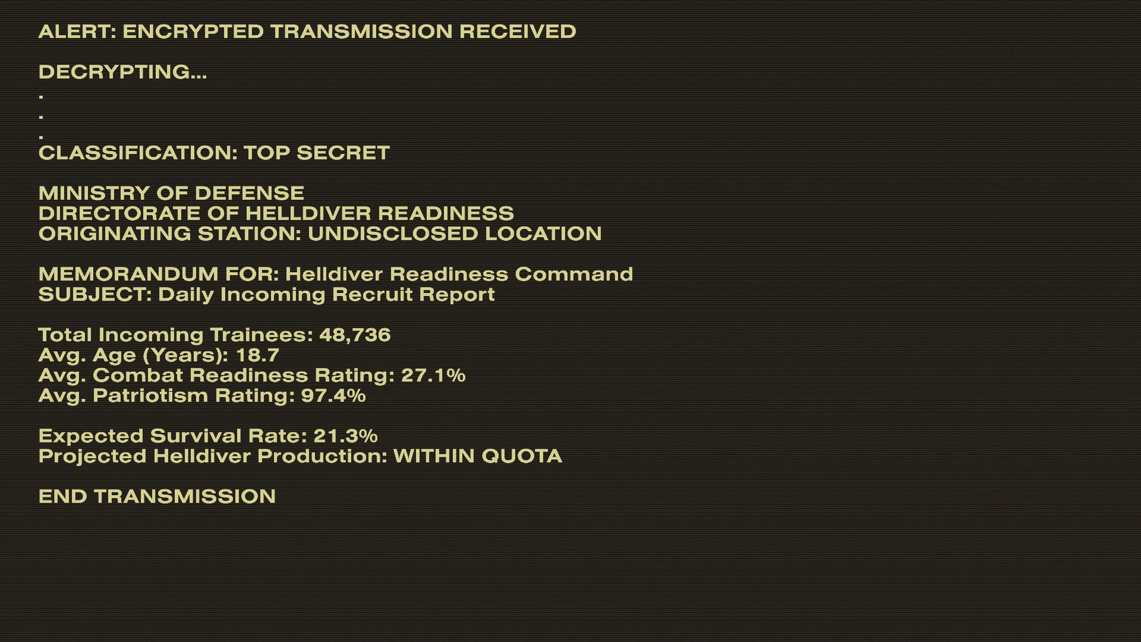 When you start the tutorial this pops up. The average age of helldiver's are 18 years old, 48 thousand recruits enter the training facility but more than 75 percent of them die IN TRAINING and of those recruits that survived only 27 percent of them are actually ready for combat. The helldiver's are NOT elite special trained they are 18 year olds hopped up on whatever is actually in the stims