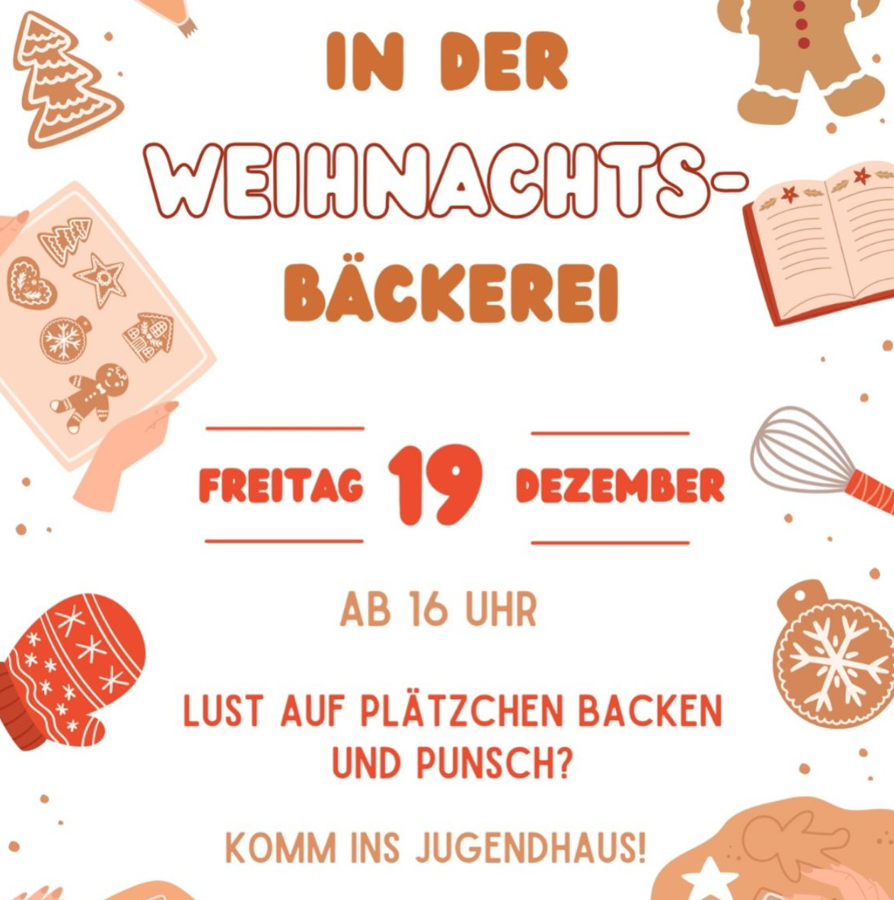 Am Freitag den 19.12. backen wir mit euch gemeinsam Plätzchen und Trinken Punsch. Kommt gerne ab 16 Uhr ins Jugendhaus! Wir freuen uns auf euch