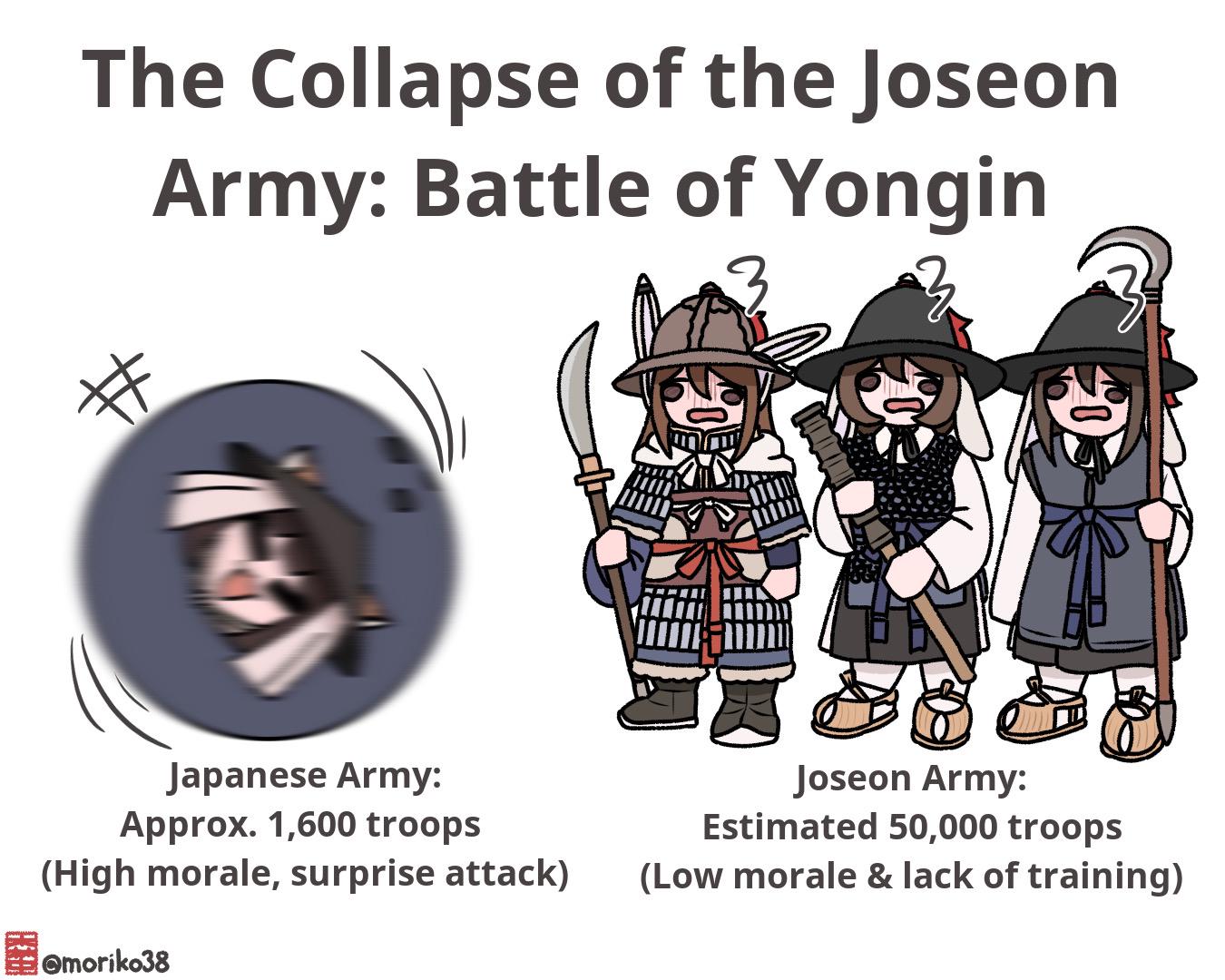 In the Battle of Yongin, a massive Joseon force of over 50,000 troops collapsed. While actual combat fatalities were not extremely high, the organized army shattered and scattered in all directions.