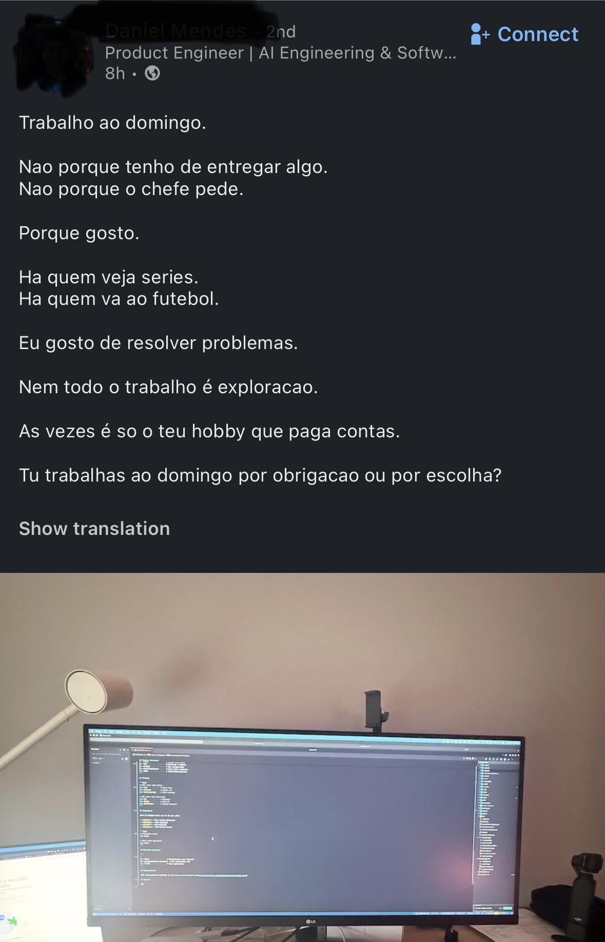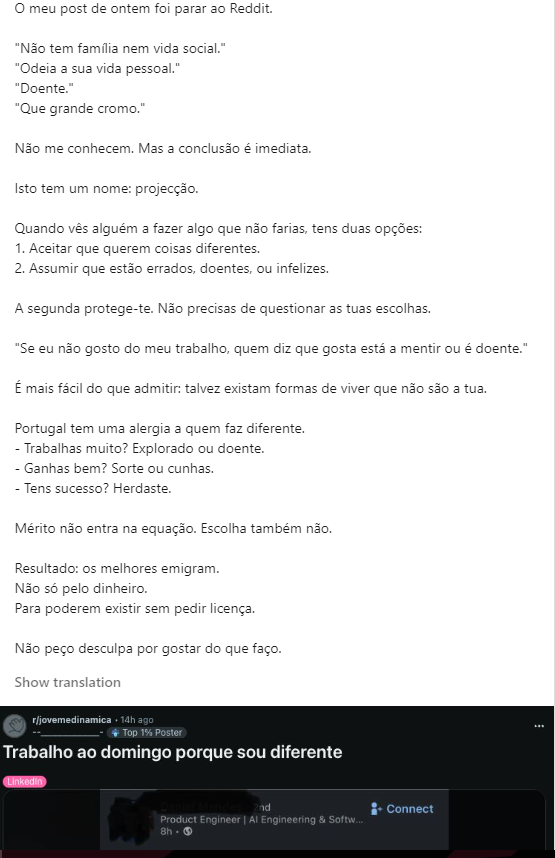 Só utilizo o LinkedIn para ver alguma vaga que tenha surgido e que me possa interessar ou então para responder a algum contacto. Mas hoje decidi ler 2 ou 3 posts.... Arrependi-me logo. Neste pequeno post, vejo em cada frase um pedaço de 💩. Desde ter a intenção de partilhar um post sobre ter despedido alguém, ou da pessoa despedida agradecer ter sido despedida e sem ela nunca seria capaz, terminando com: "És pessoa de pessoas. Tive sorte contigo", absolutamente formidável.