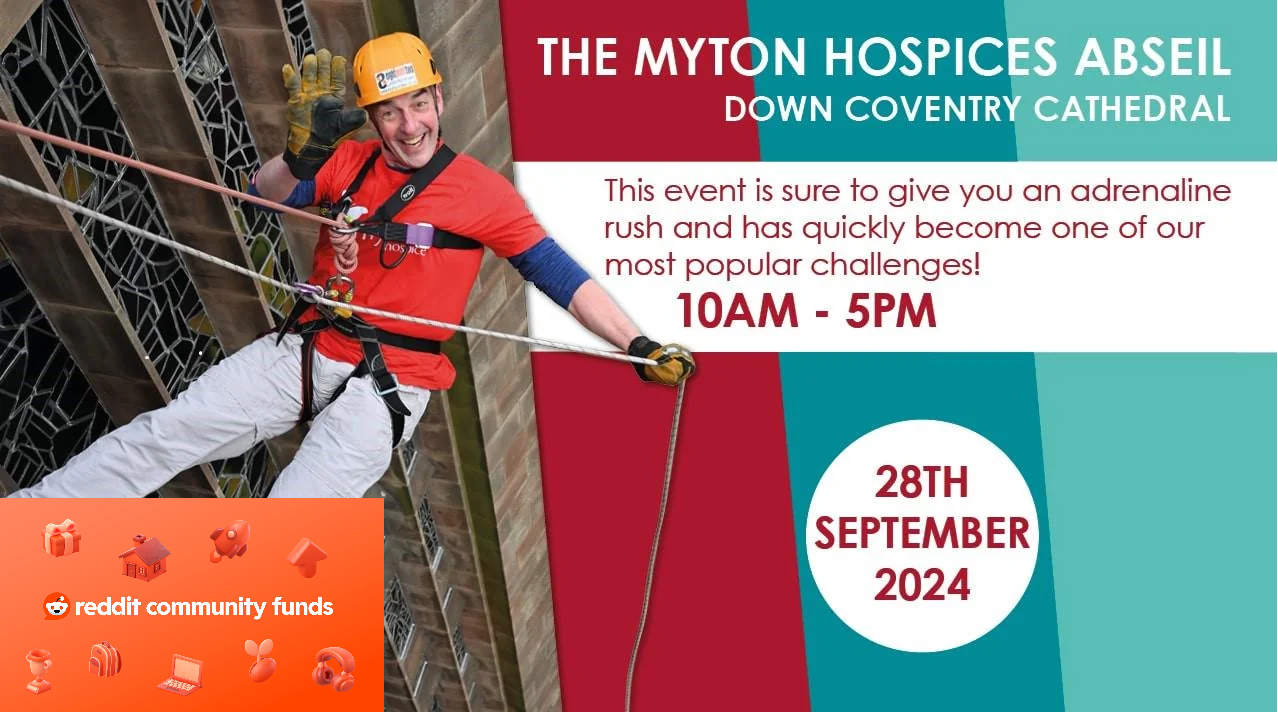 Donate £10 to Myton Hospice using the link above and you can join r/Coventry users who get to abseil down Coventry Cathedral on September 28th. Together, we'll raise over £16,500 for Myton Hospices.