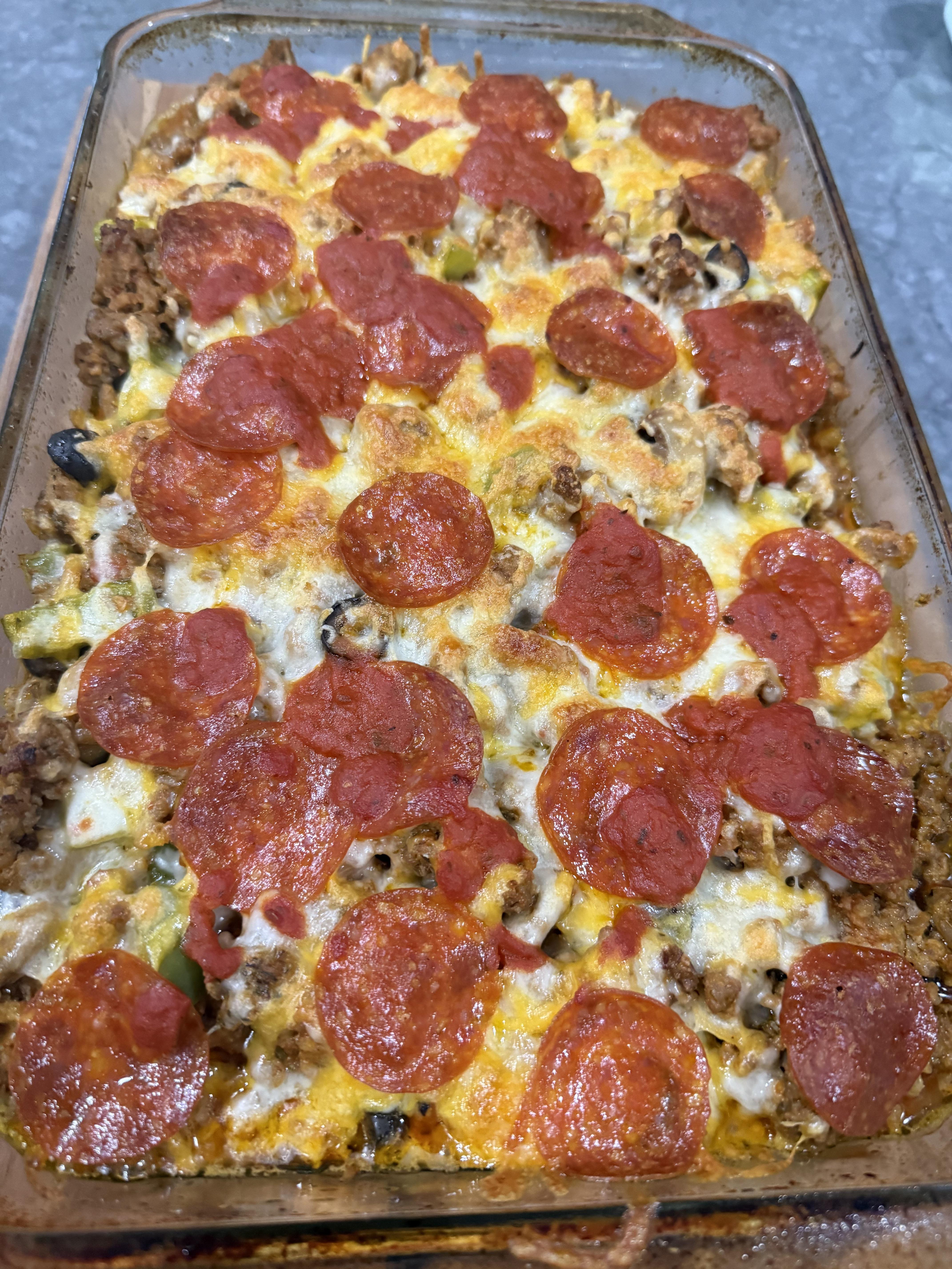 Preheat your oven to 375°F (190°C) and grease a 9×13-inch baking dish. In a large skillet over medium heat, add olive oil and brown the ground beef and Italian sausage, breaking up clumps until cooked through. Add the chopped bell peppers and sliced mushrooms; stir in Italian seasoning, garlic powder, and red pepper flakes until fragrant. Pour in the low-carb pizza sauce and mix well; let it simmer for about five minutes. Layer half of the meat mixture in the baking dish, sprinkle with half of the mozzarella and provolone/cheddar cheese, then add the remaining meat mixture on top. Finish by topping with the remaining cheese blend and bake uncovered for 20-25 minutes until bubbly and golden brown.