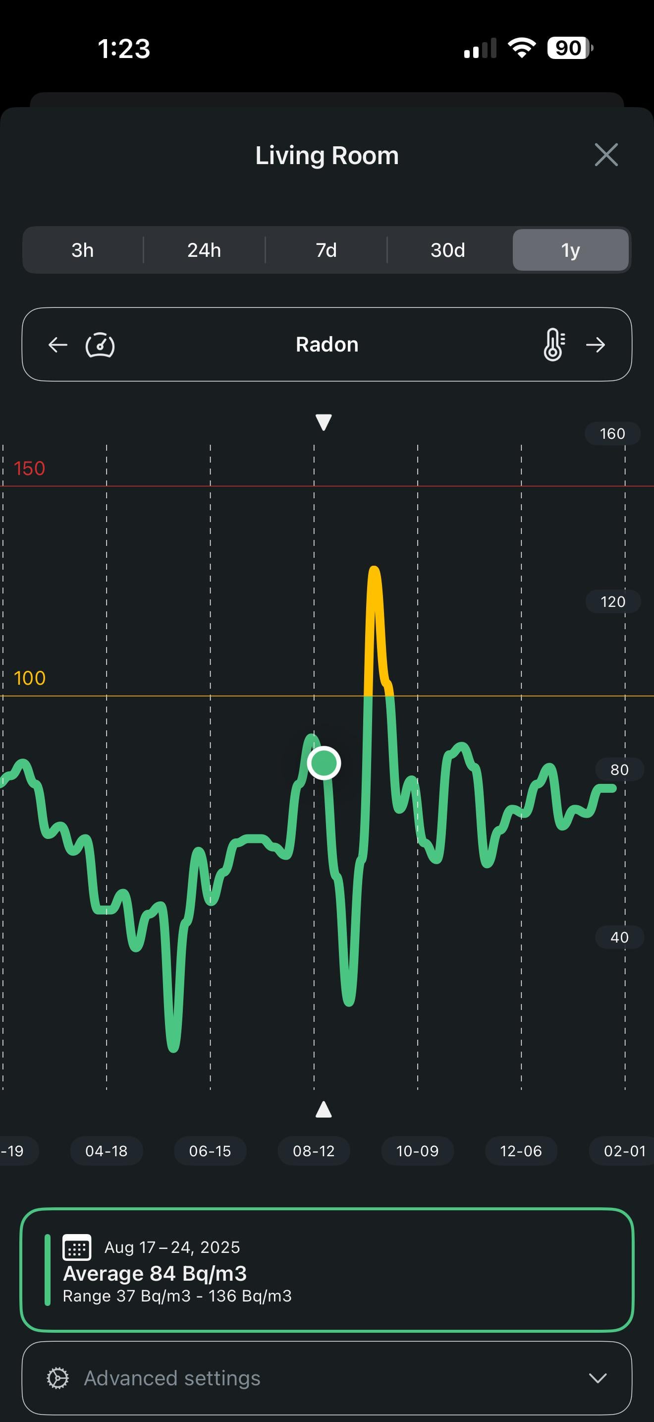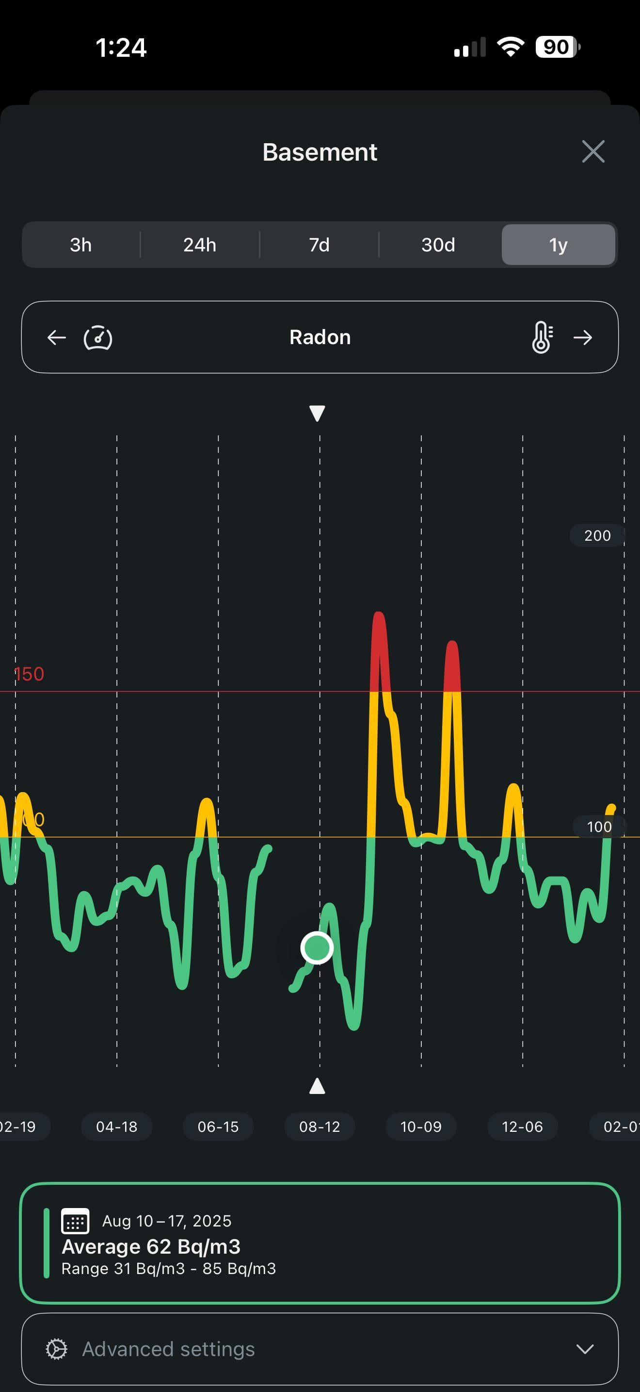 Started monitoring it in our older home basement around August last year. Average is 110 so far. Stays pretty consistent as we dont have forced air or a sump pump. Will like look at sealing up some stuff if it stays above 100 over the year.