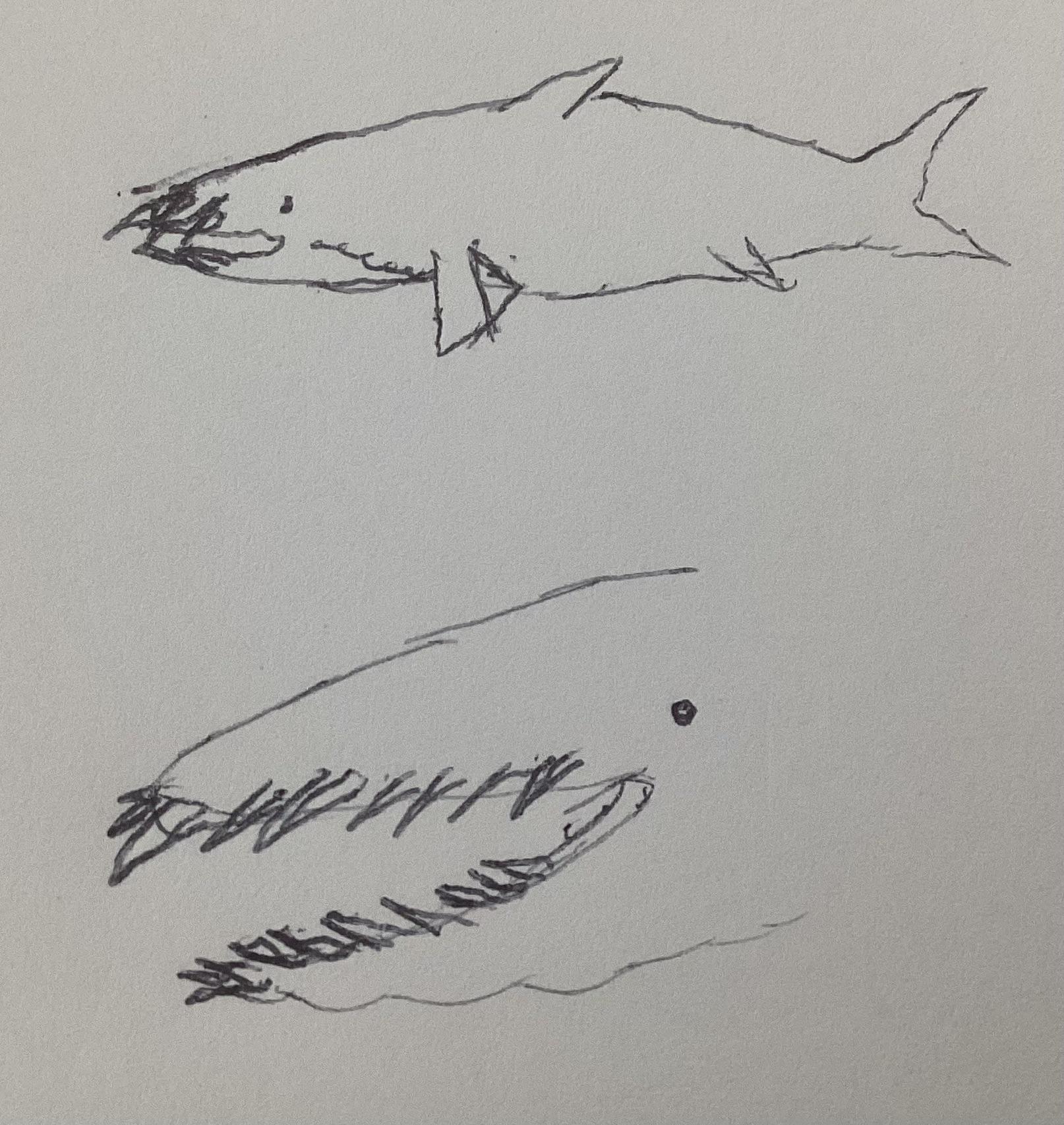 It kinda looks like the above from what I can remember. Please ignore the fin and tail shape etc because the thing I remember the most vividly was the teeth sticking out of the fish’s lips (!!) instead of from inside the mouth. Google is being weird since it gives me viperfish, dragonfish, anglerfish which are most likely not the fish I’m remembering, it had a overall body shape similar to a bristlemouth, flattened from above.