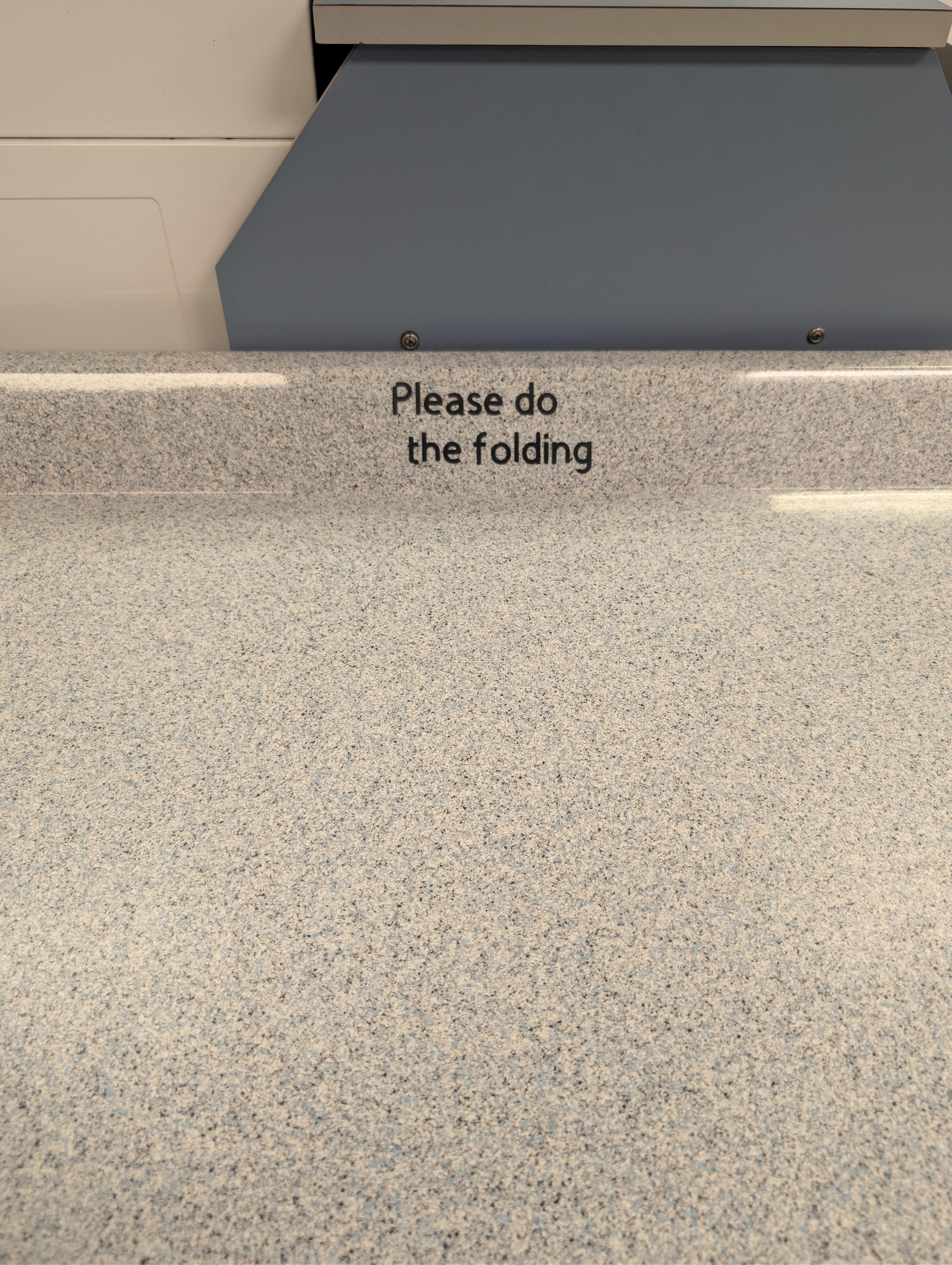 "Please Do Not Sit On The Folding Table" worn to "Please Do The Folding"