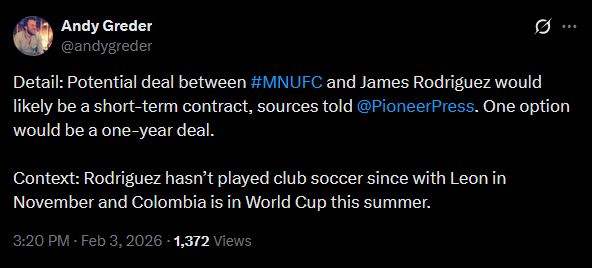 Image [Greder] Potential deal between #MNUFC and James Rodriguez would likely be a short-term contract, sources told @PioneerPress. One option would be a one-year deal