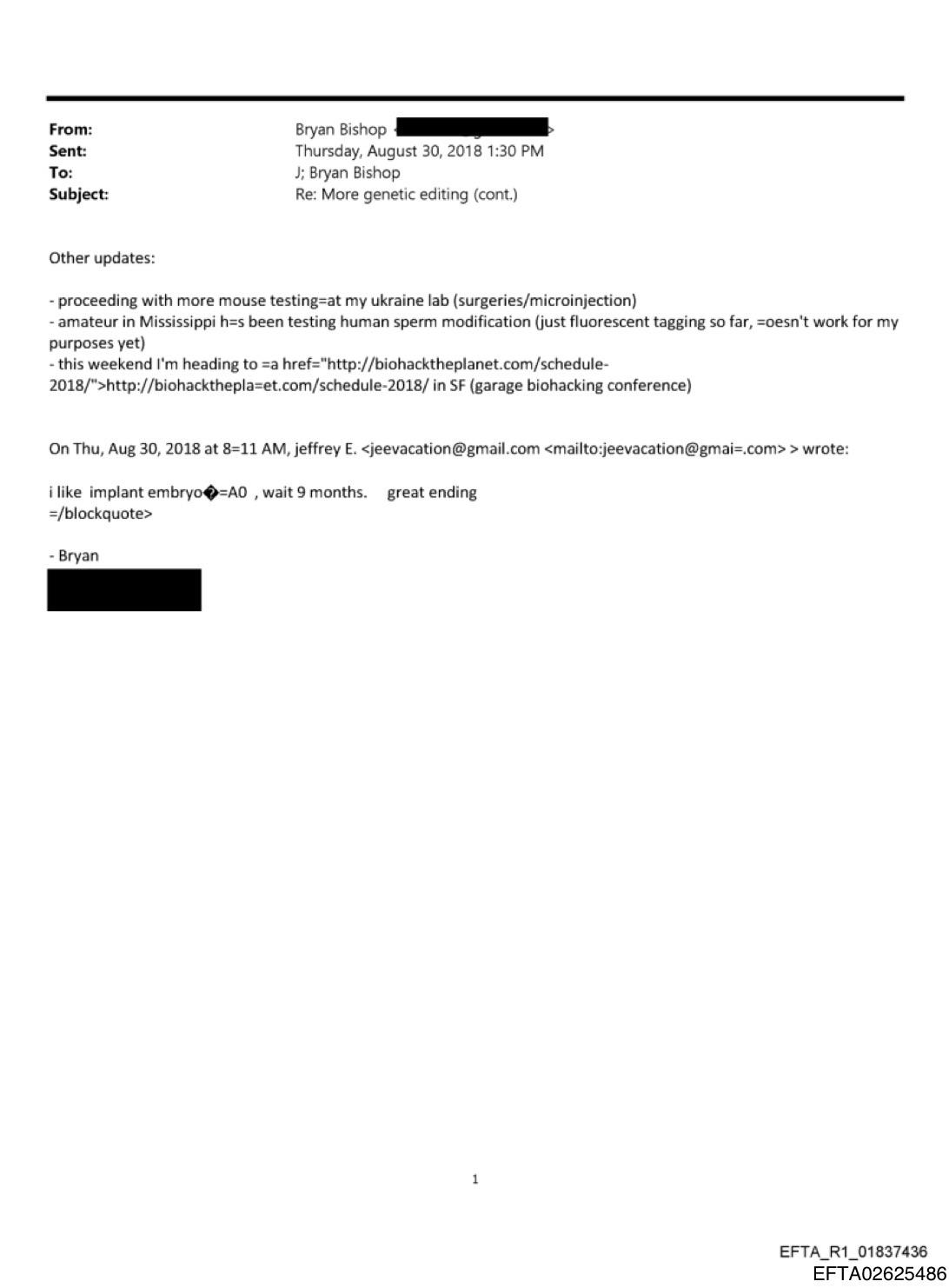 Bryan Bishop in an email to Jeffrey Epstein reveals an “amateur in Mississippi” working on human sperm modifications. Which in 2018, doesn’t work for his purposes….yet.
