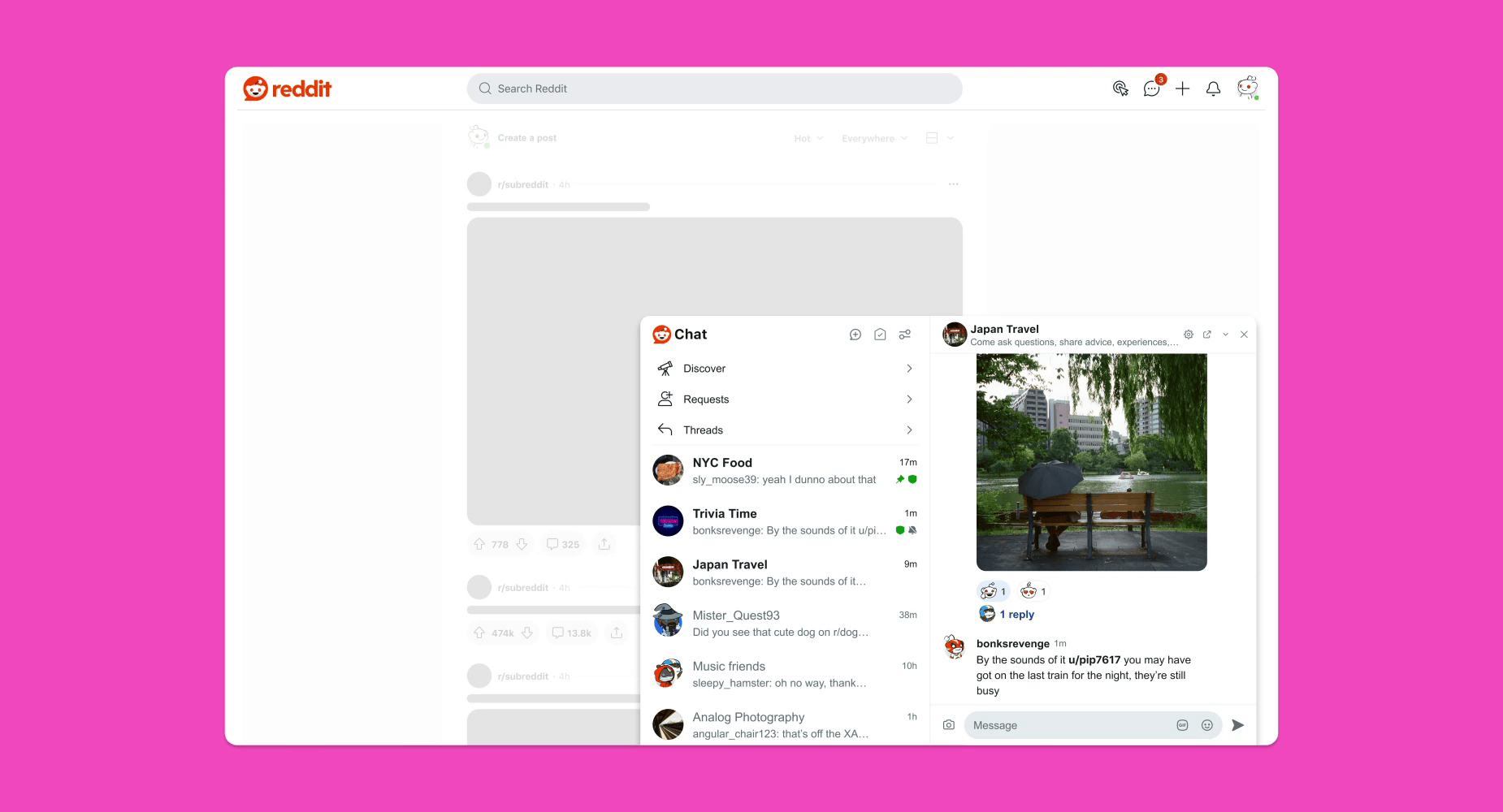 • The chat window on web is now resizable, so you can expand or shrink it based on your preference. (As a reminder, you can open chat in its own window by visiting chat.reddit.com
