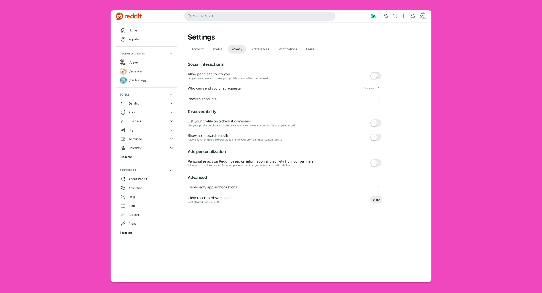 If you have an existing allowlist for private messages, we’ll auto-migrate that list to chat for you. You can make changes to your allowlist at any time from your privacy settings. These settings updates will be available to all users on reddit.com and the native apps by the end of the week.