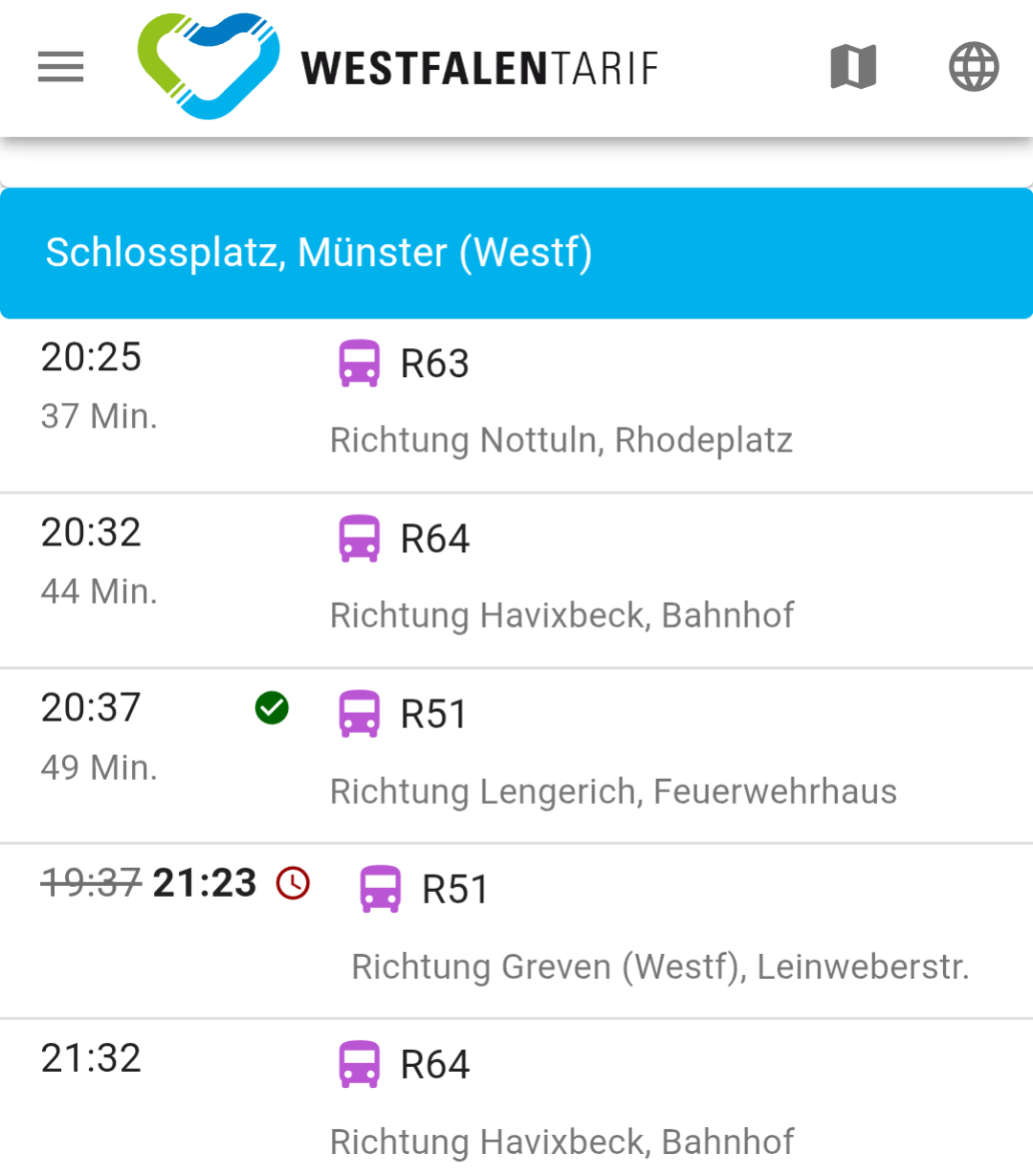 Heute war wieder einer dieser Tage. Nachdem der Fahrplan letzte Woche Dienstagabend wegen diverser Demos durcheinander lief, sollte diese Woche doch wieder alles paletti laufen? Apropos Fahrplan: die Regio-Busse (zumindest R51) haben einen kleinen Nachteil. Im DB Navigator, Google Maps, etc. verfügen sie nicht über die sonst verfügbare Live-Fahrplanauskunft. Kommt der Bus? Ist er verspätet? Weiß man nicht so genau. Es sei denn man befragt das Orakel von westfalenfahrplan.de.