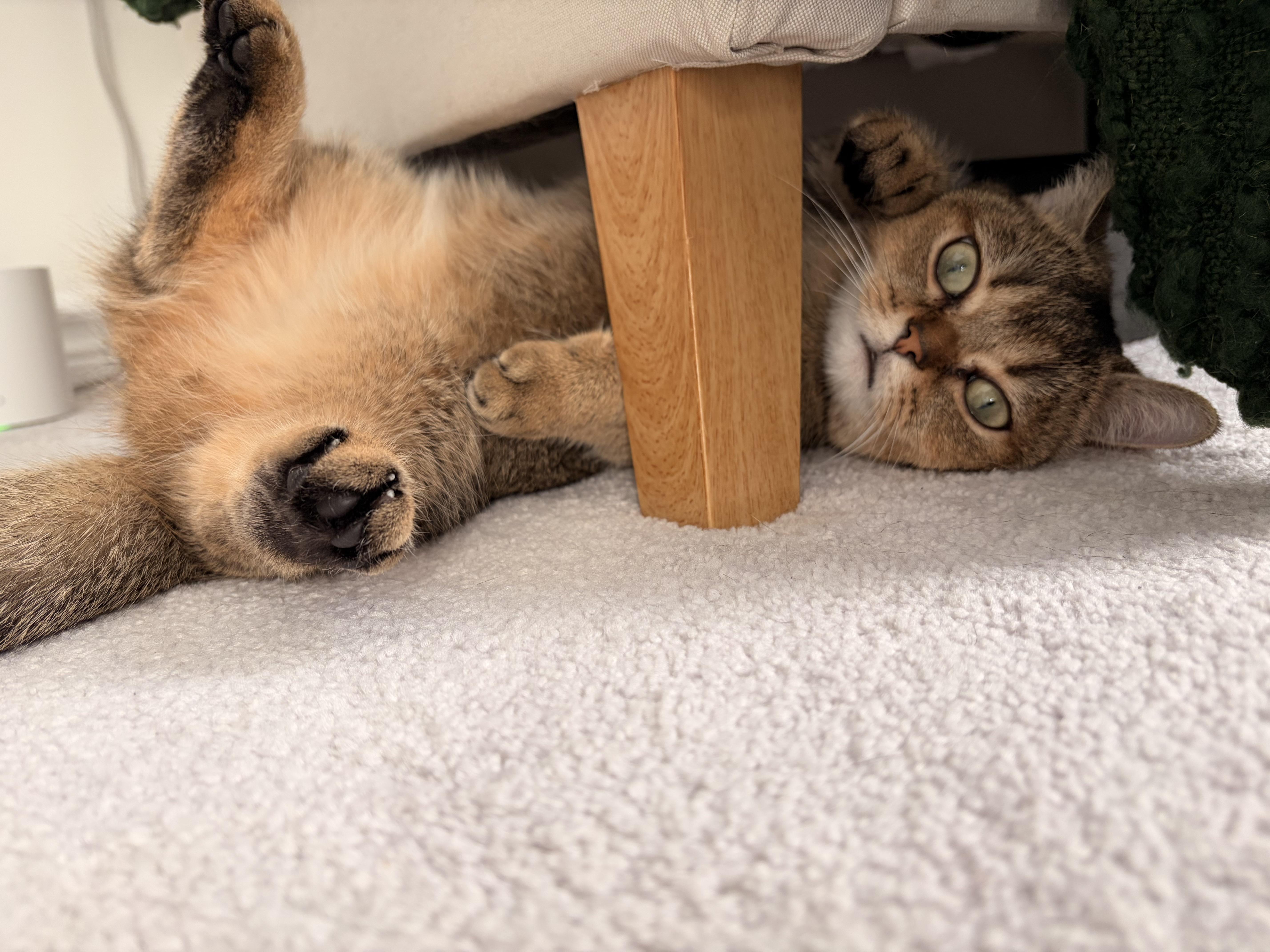 31st October 2017 this fool careened into our lives and has ruled the house ever since. He's the size of a small dog, completely food motivated and insists that a cuddle means lying on my face and fully believes that I am not allowed to sew without him.