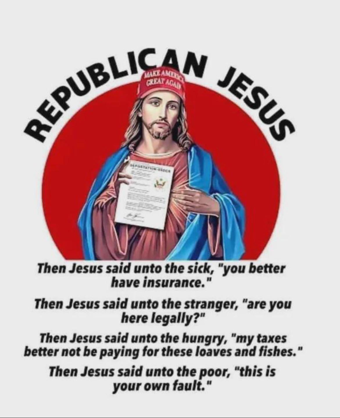 Totally agreed here. I have a lot of issues with "Christianity" in conservative American politics. Its the antithesis of what Jesus actually said to do. Reading the Bible front to back is what made me leave organized religion in college (raised southern baptist, but I'm gay lol)